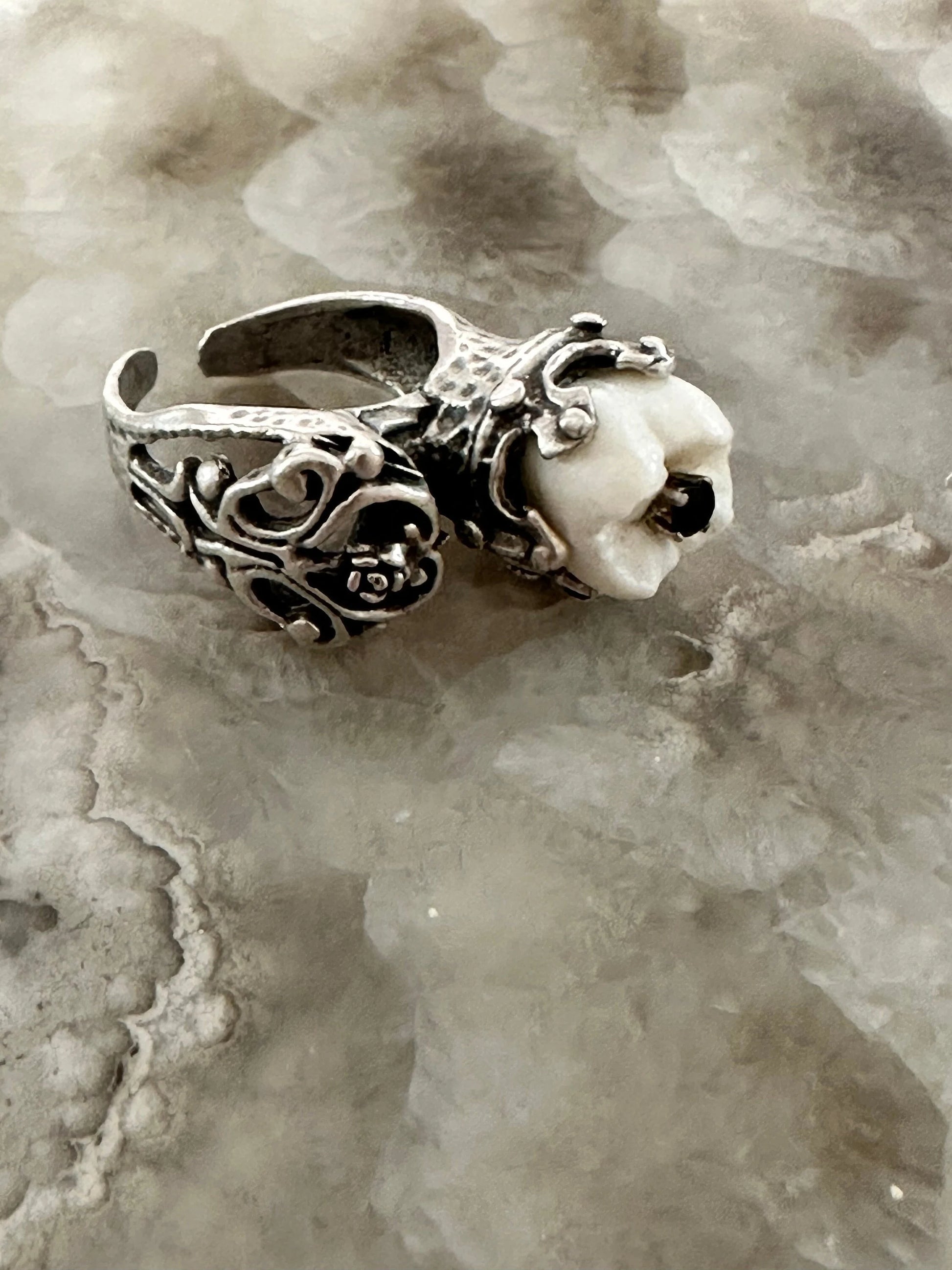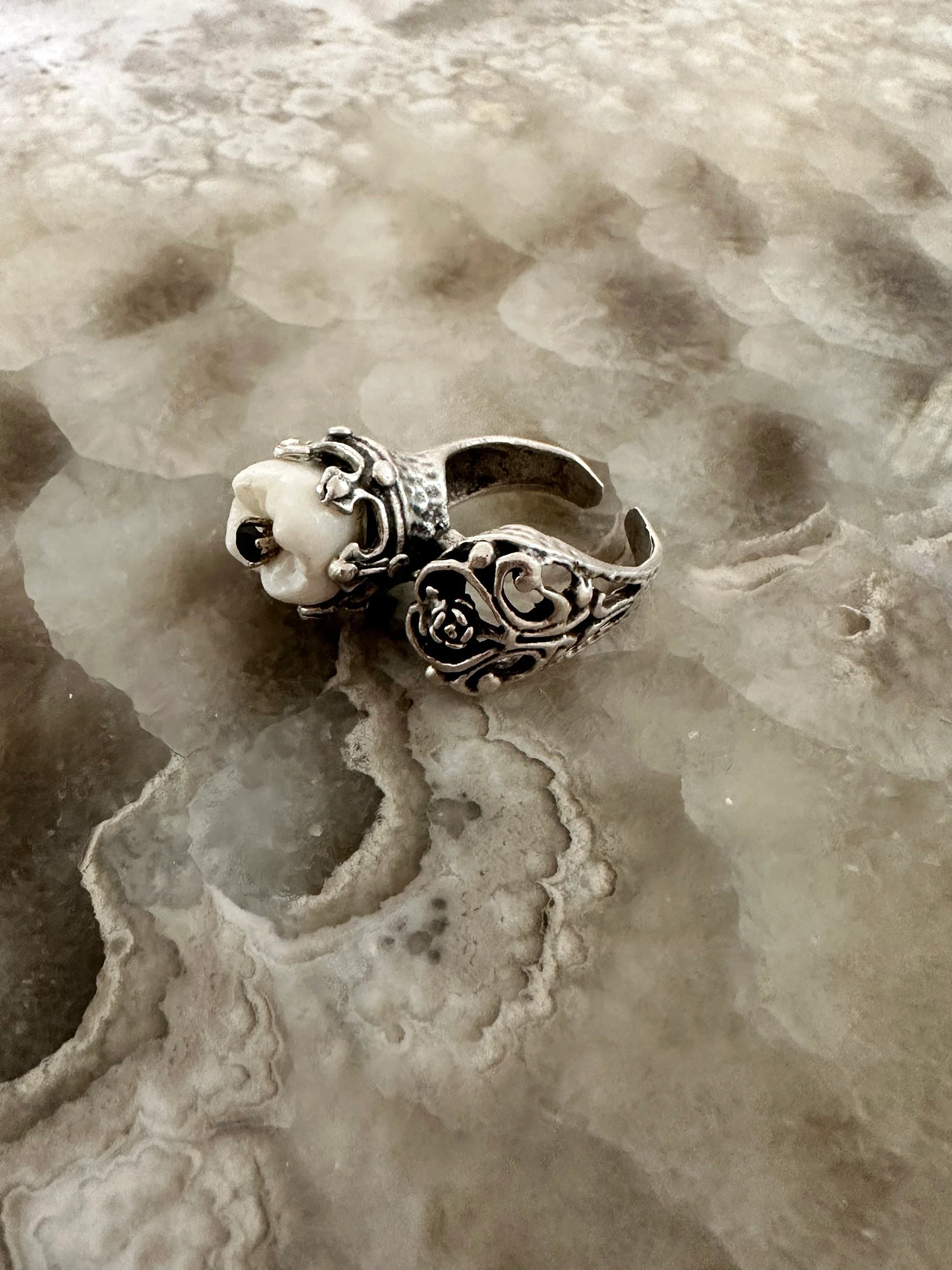 This large gorgeous ornate ring setting holds a genuine human molar with an onyx crystal cavity.