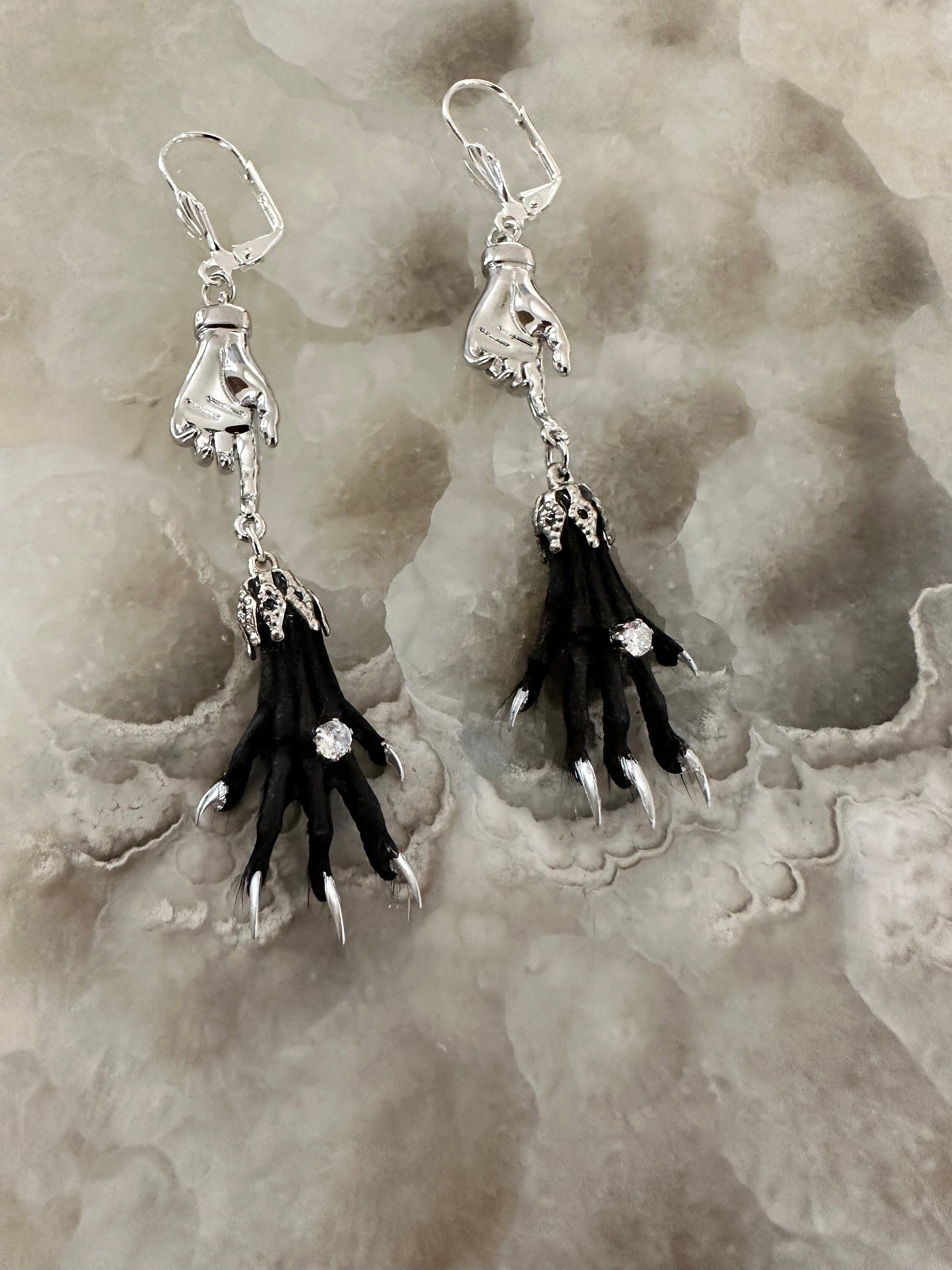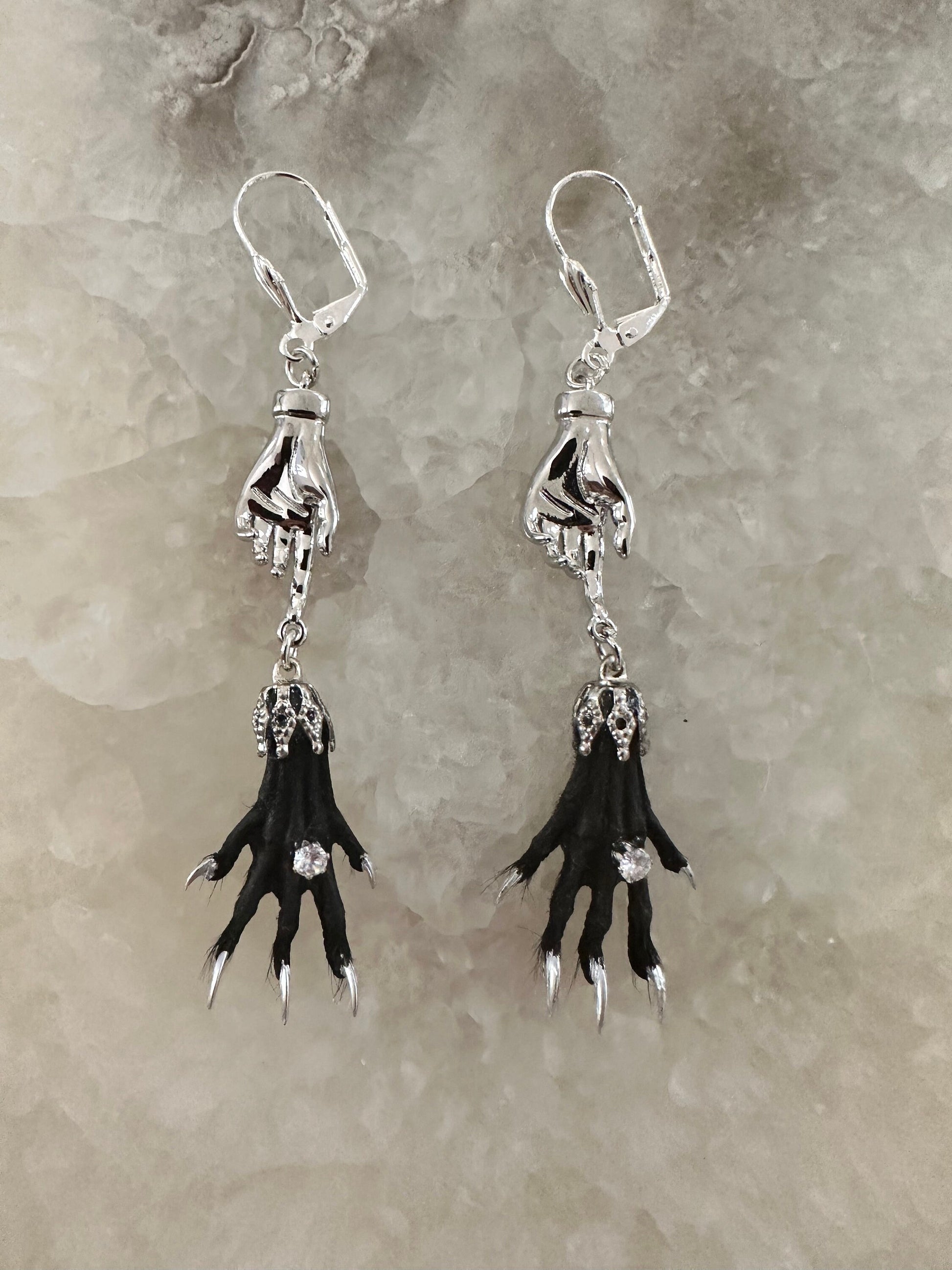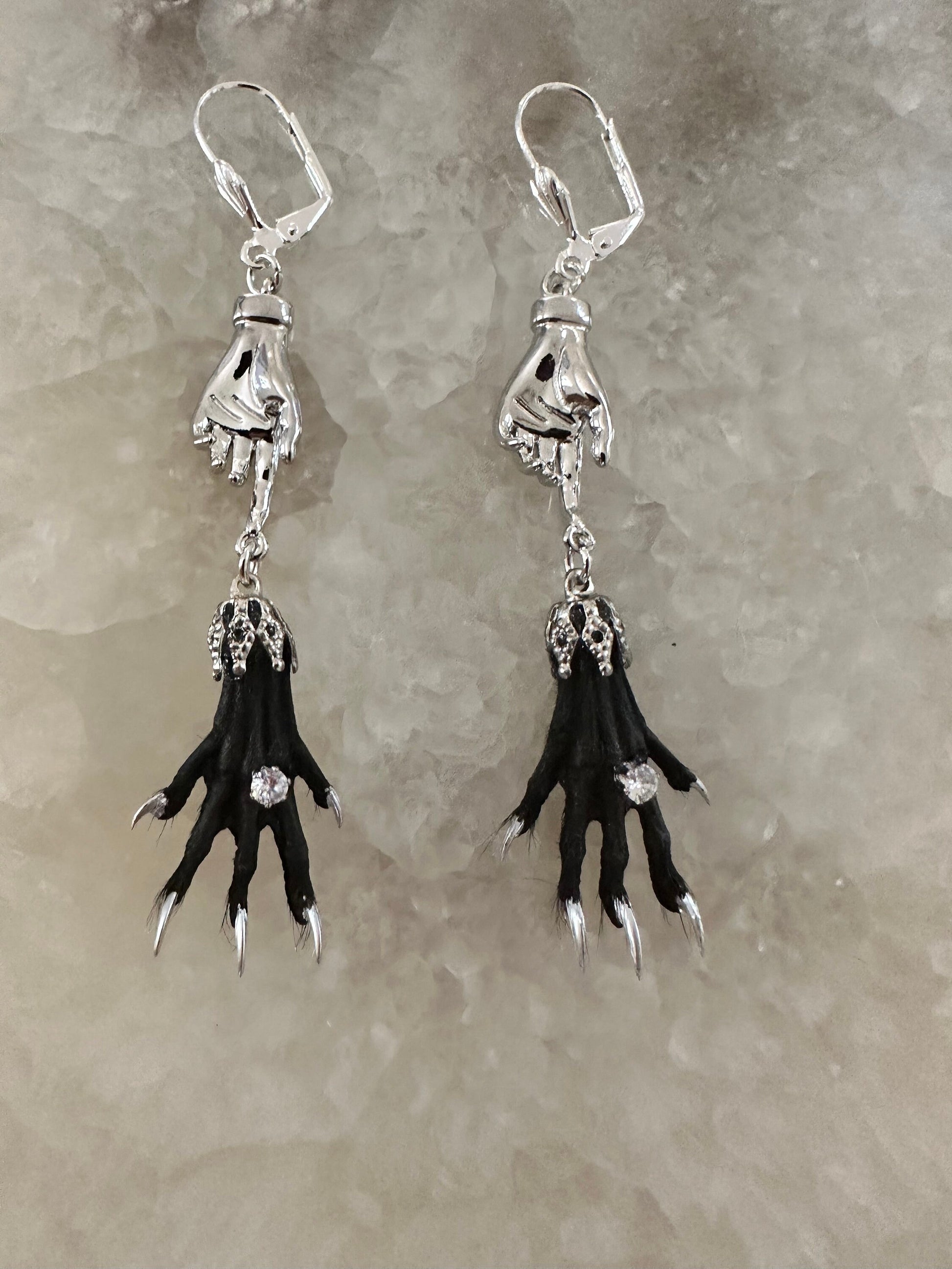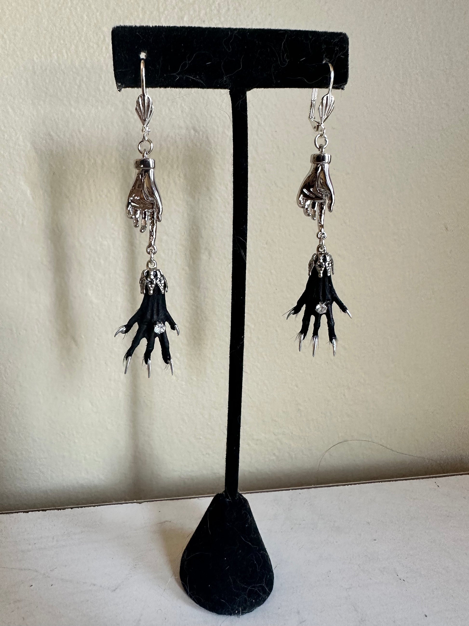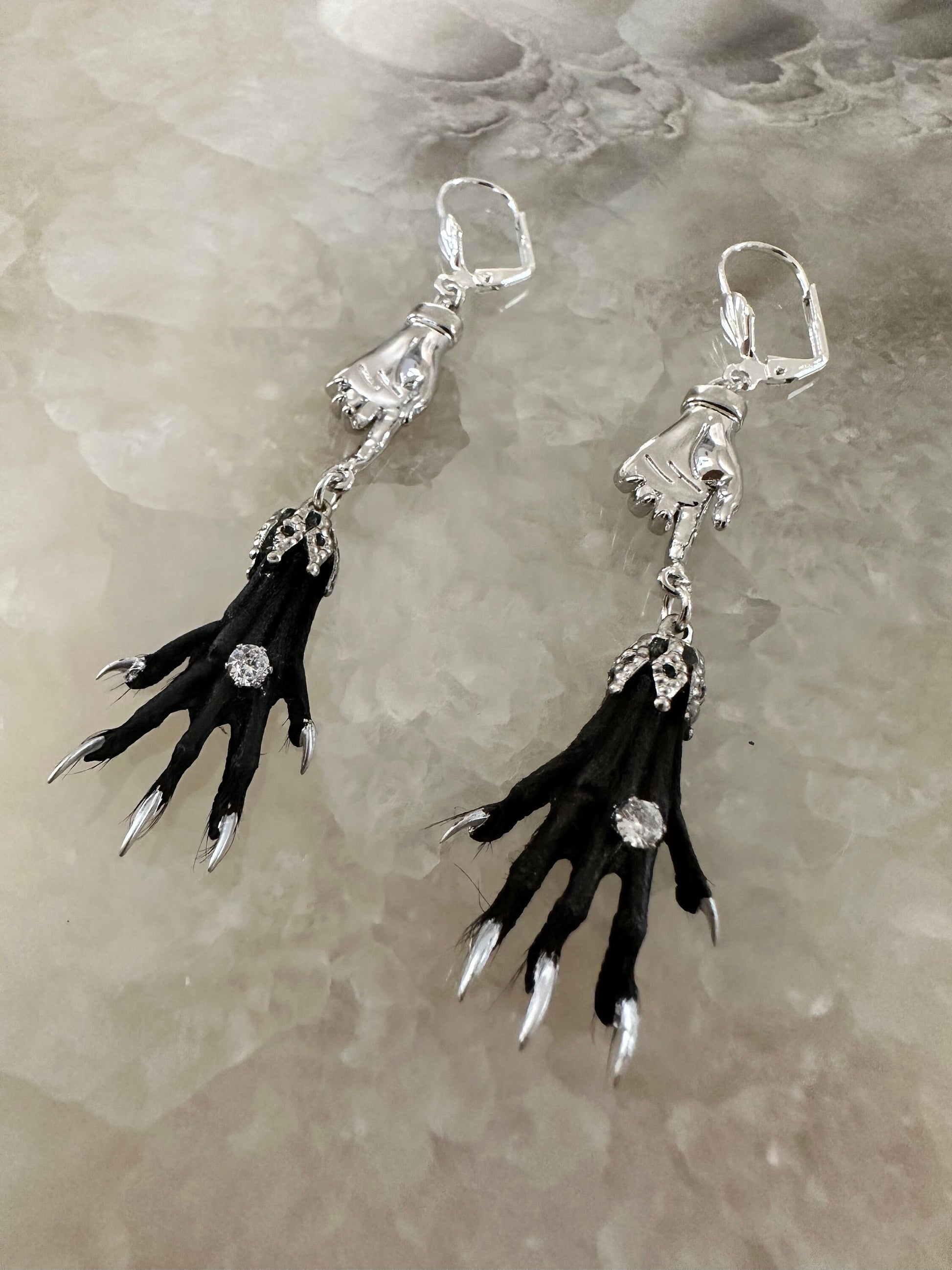 These unique earrings are made from authentic taxidermy paws that have silver gilded nails and wear crystal rings and dangle from silver hands by latch back earrings