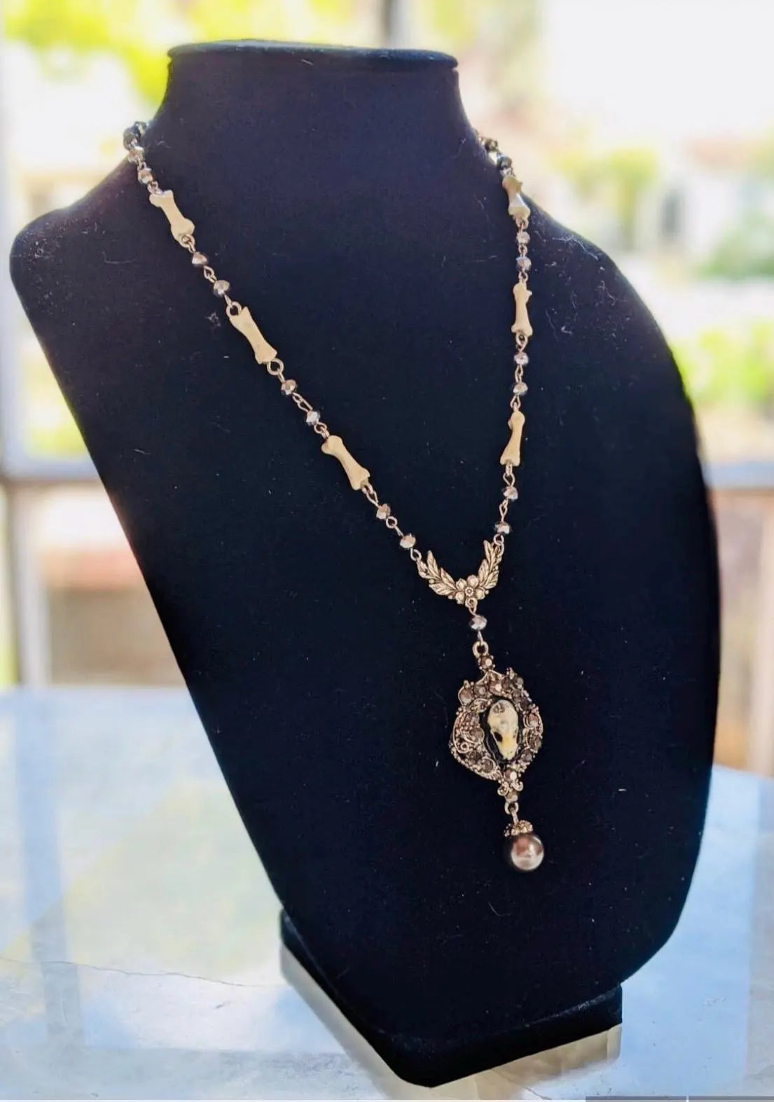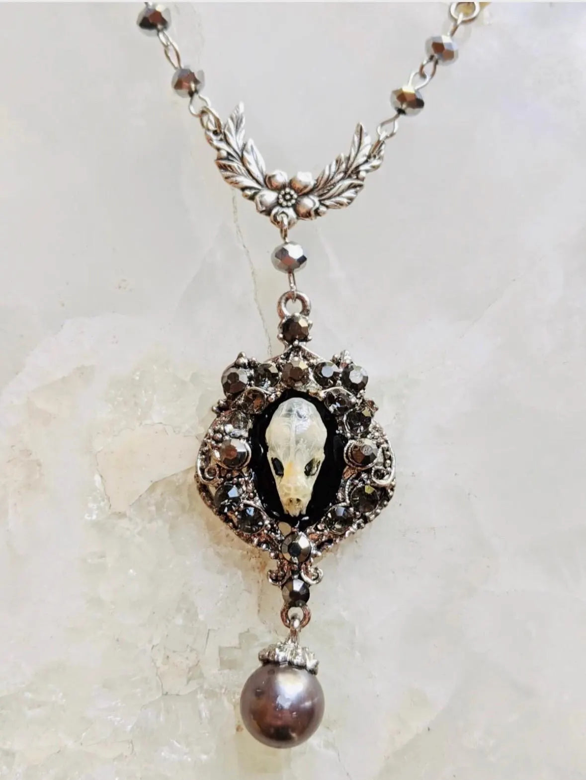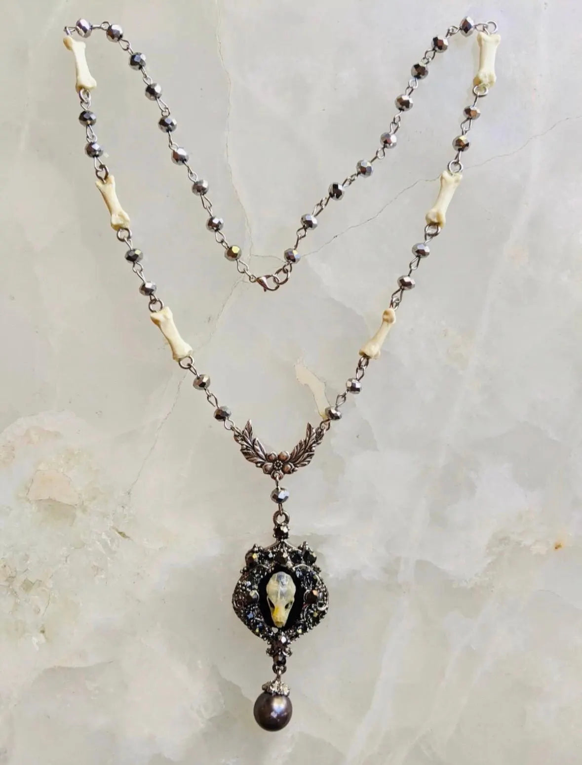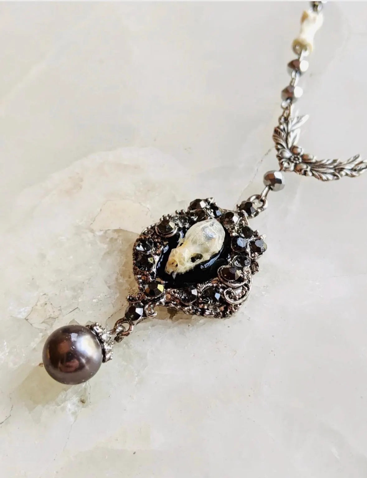 This authentic bat skull rests on a beautiful setting that dangles a large pearl and hangs from a beaded chain intertwined with real mammal bones
