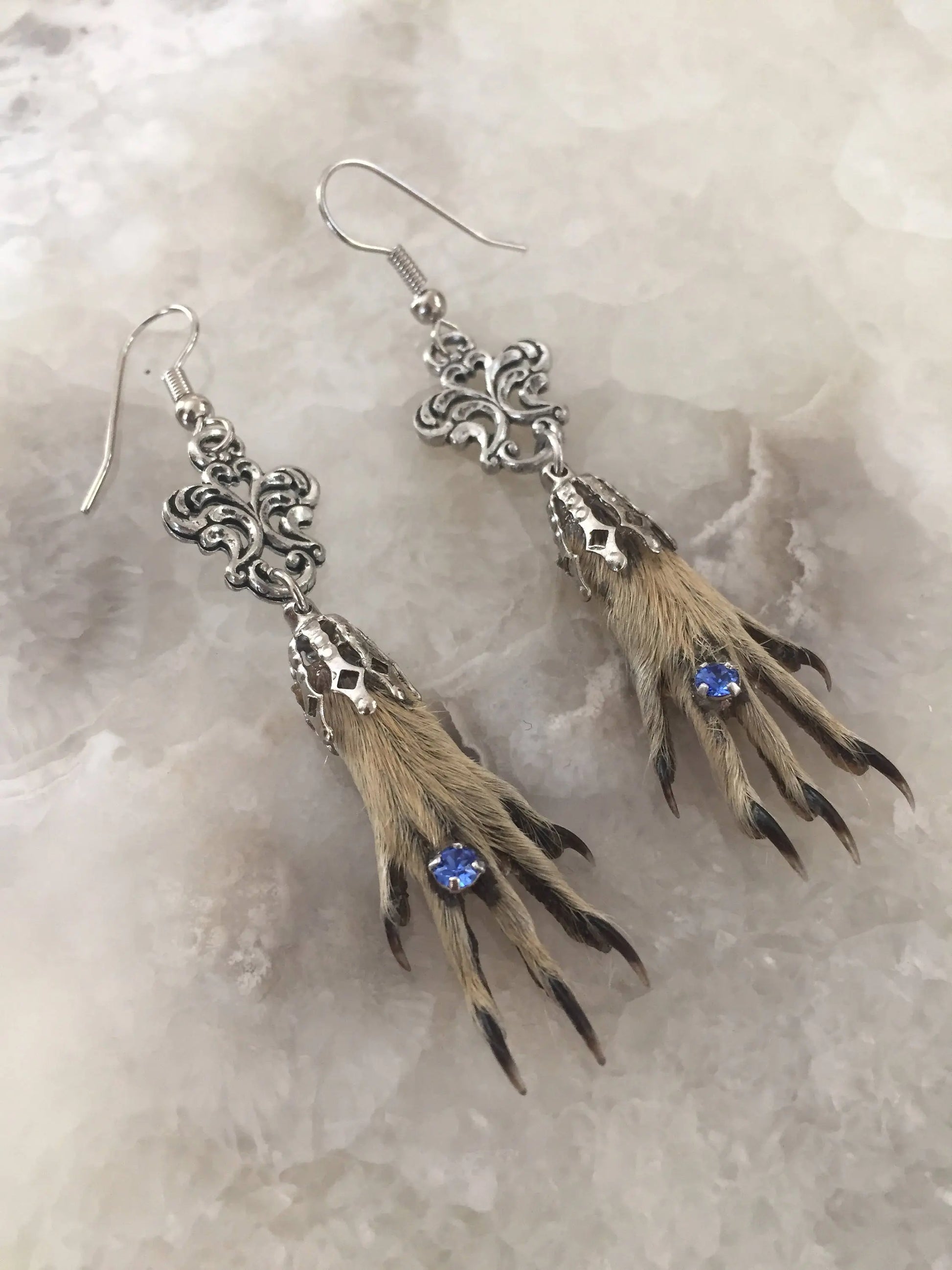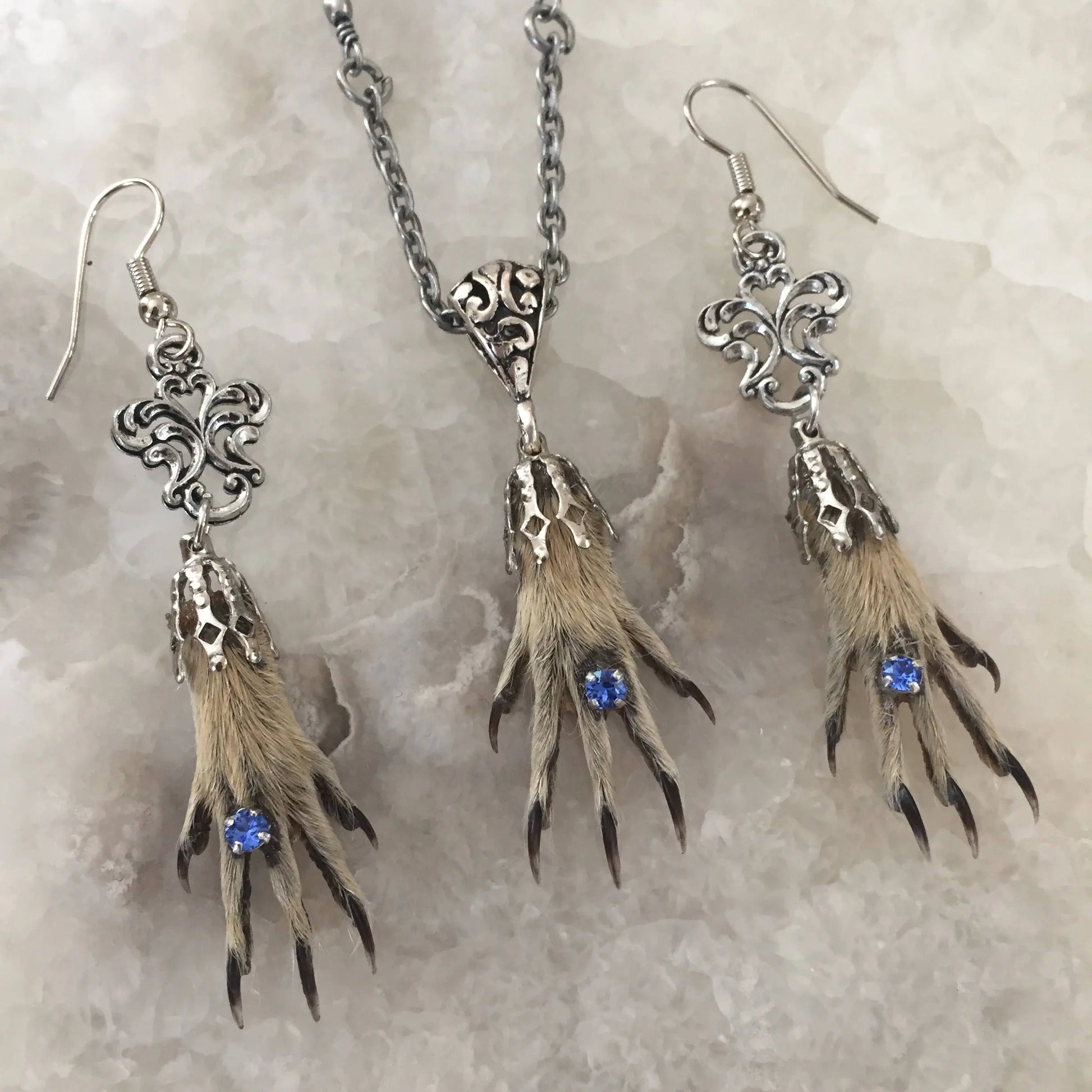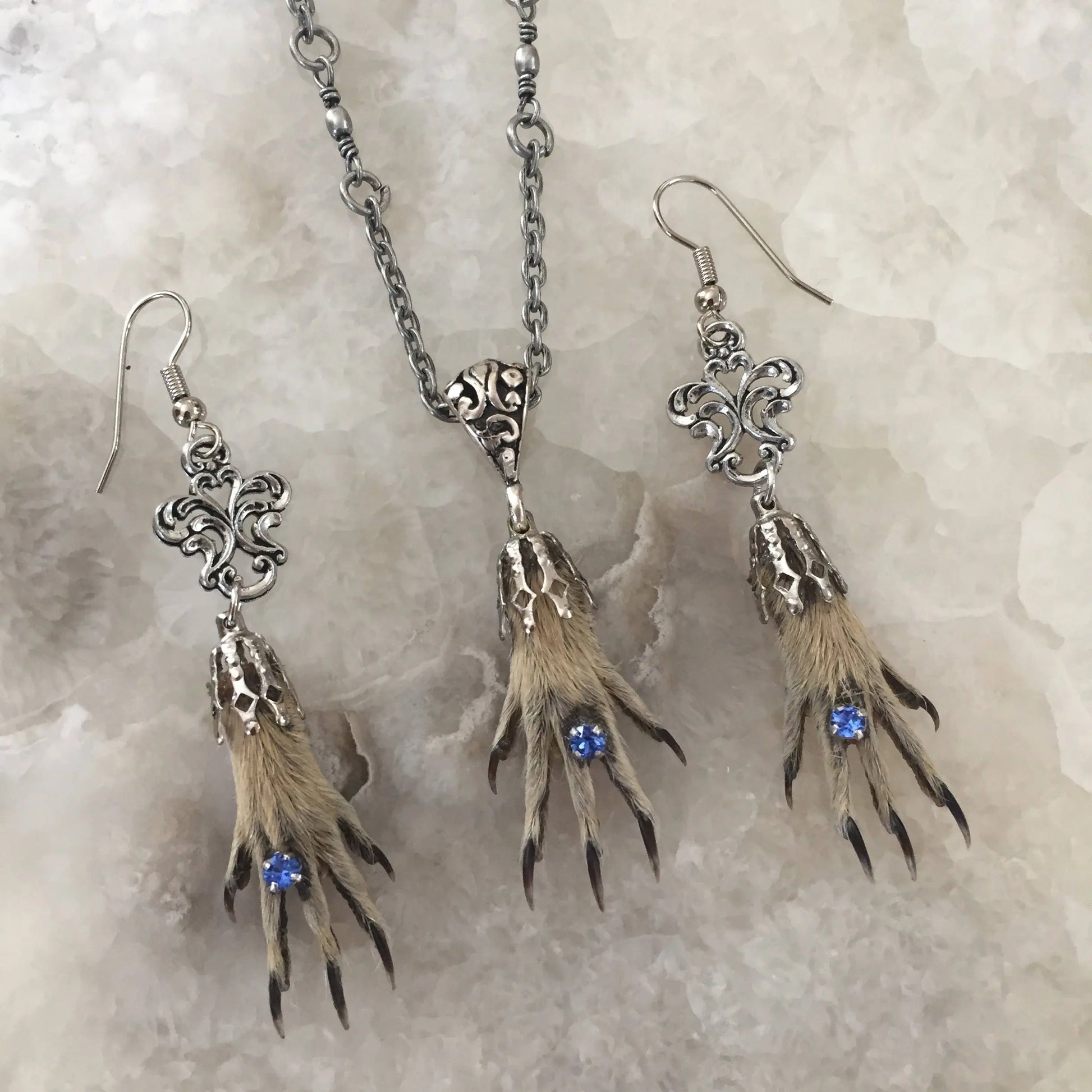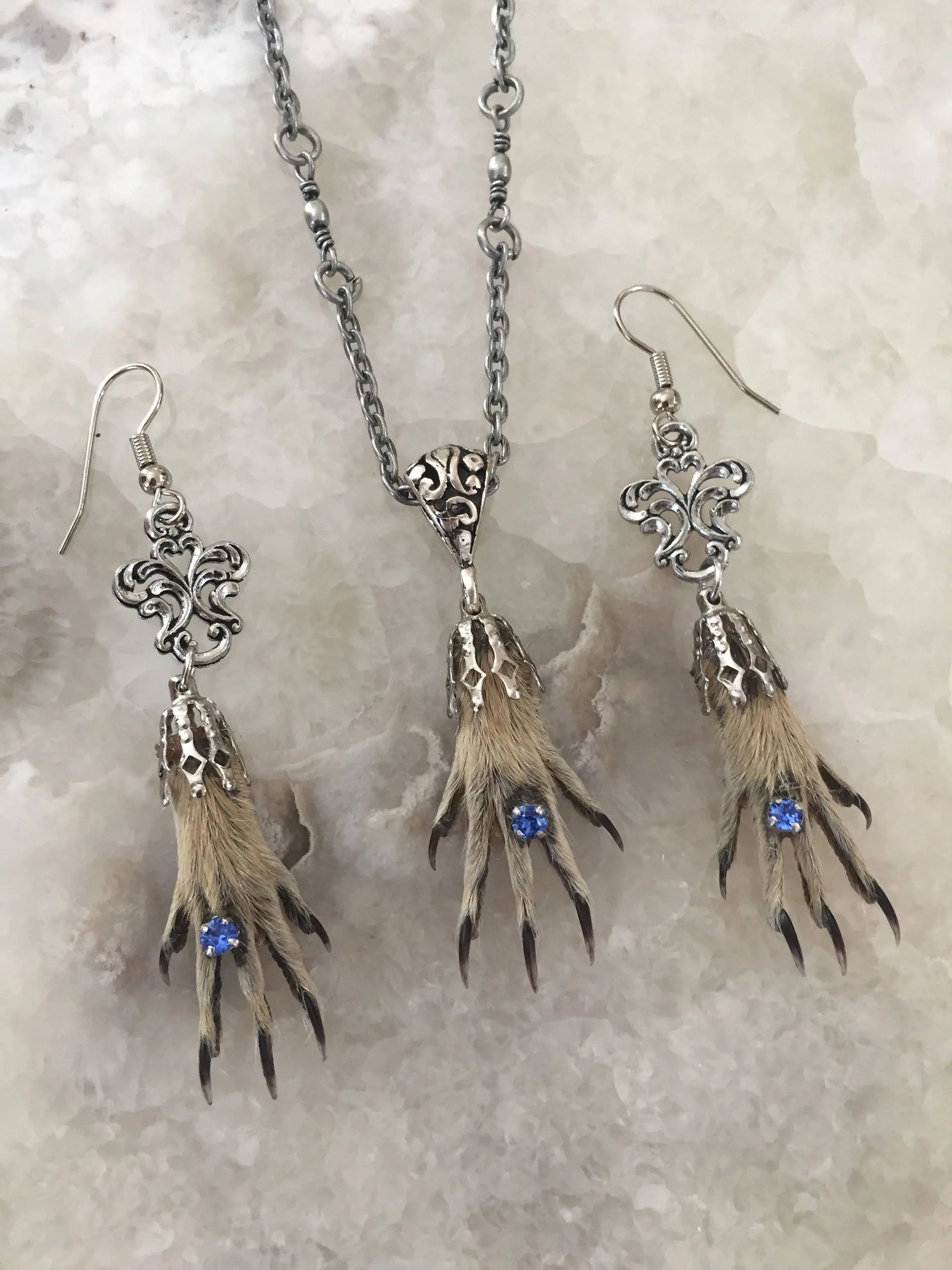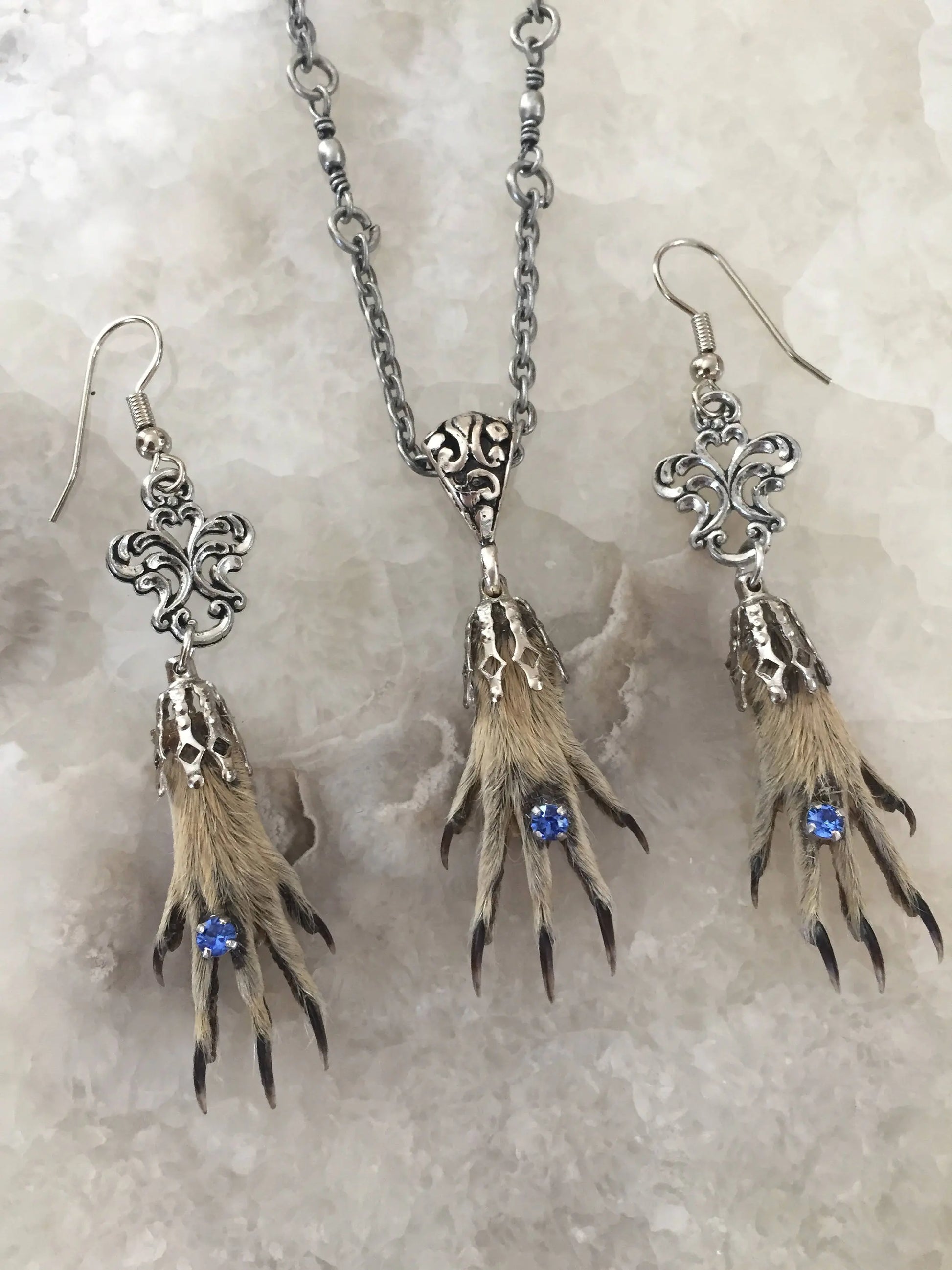 This unique jewelry set is composed of taxidermy prairie dog paws that wear blue Swarovski crystal rings and hang by silver prongs from filigree findings