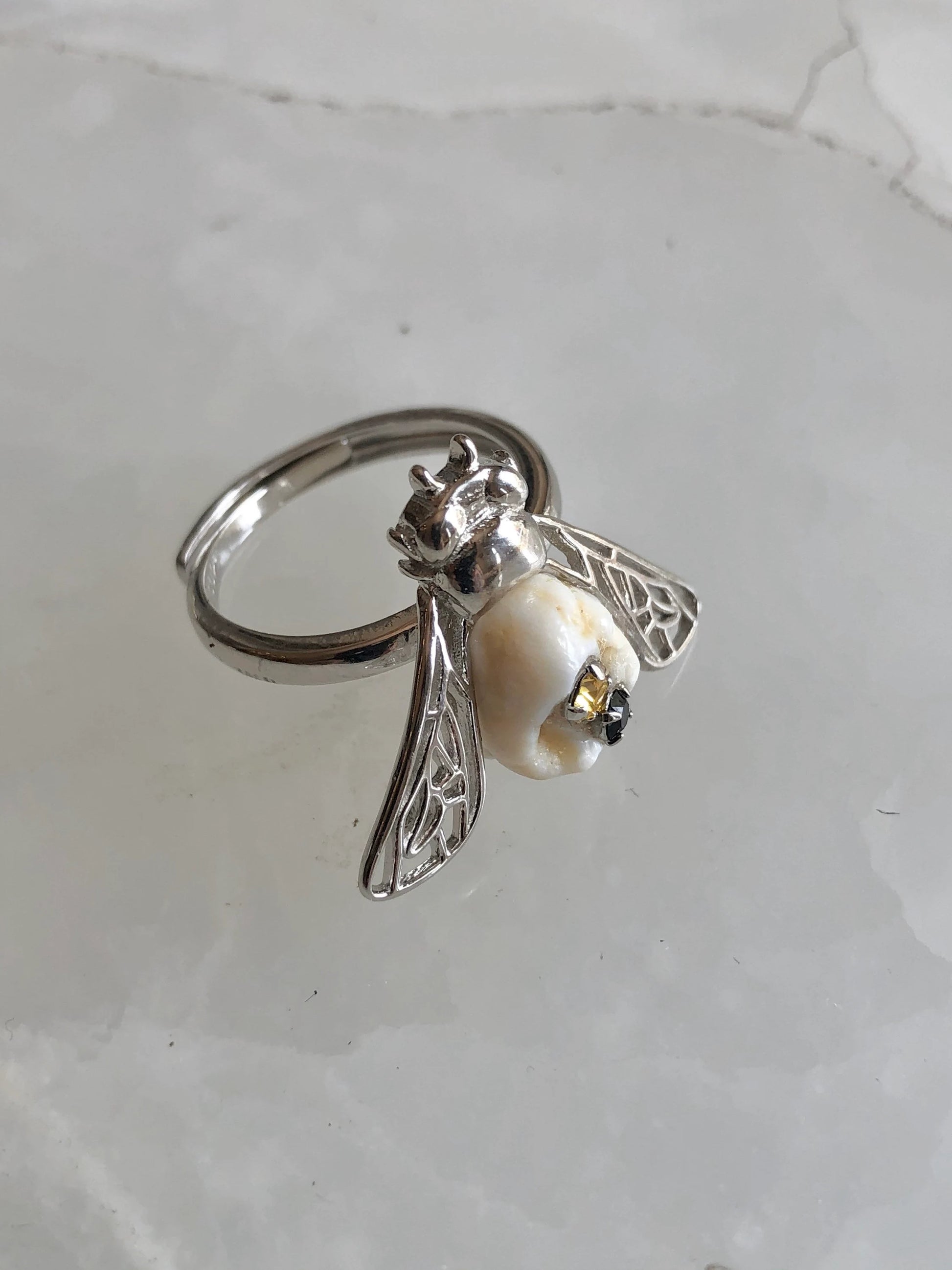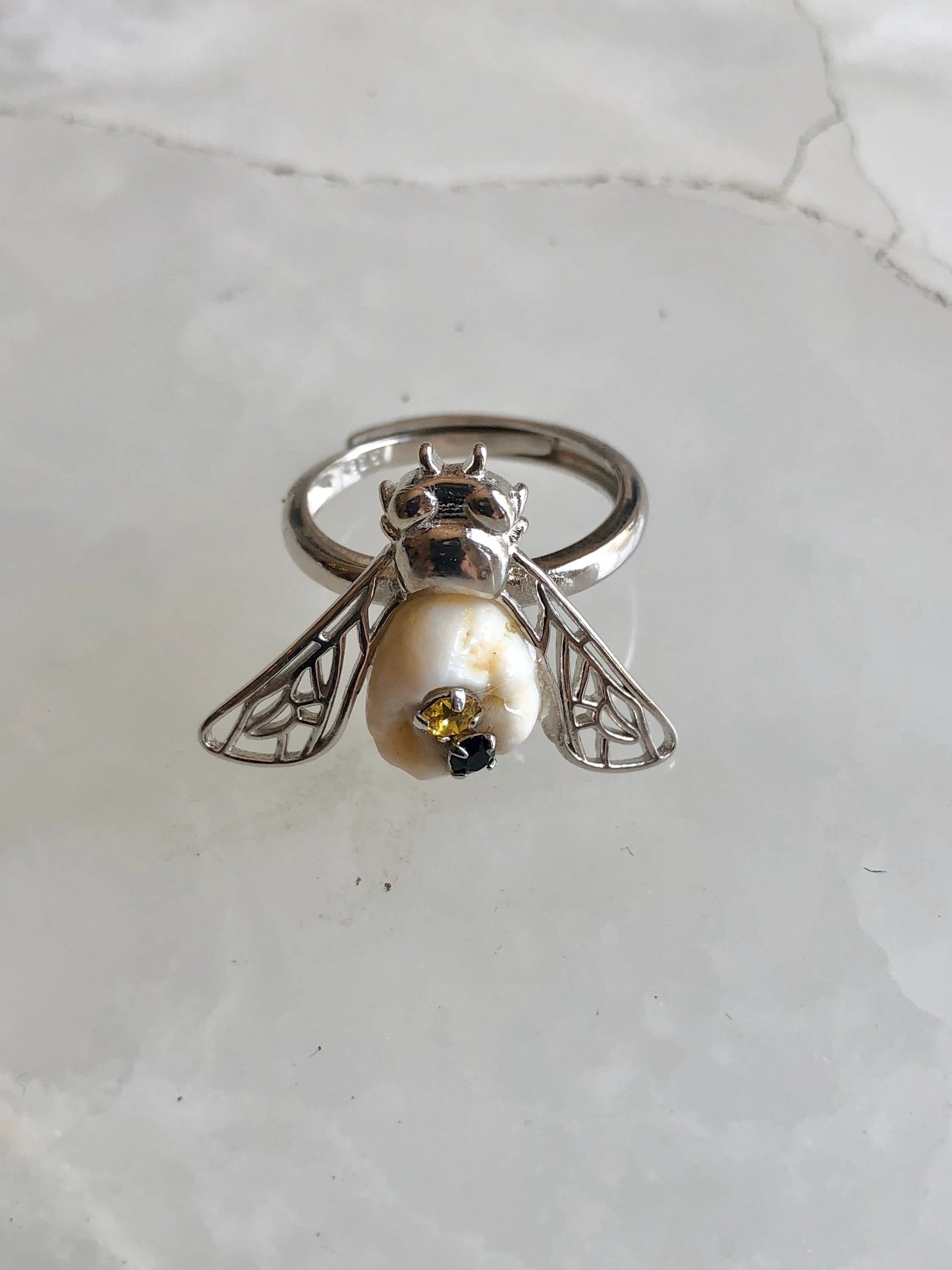 This unique ring is an adjustable sterling silver bumblebee with a genuine Human molar with yellow and black crystal cavities