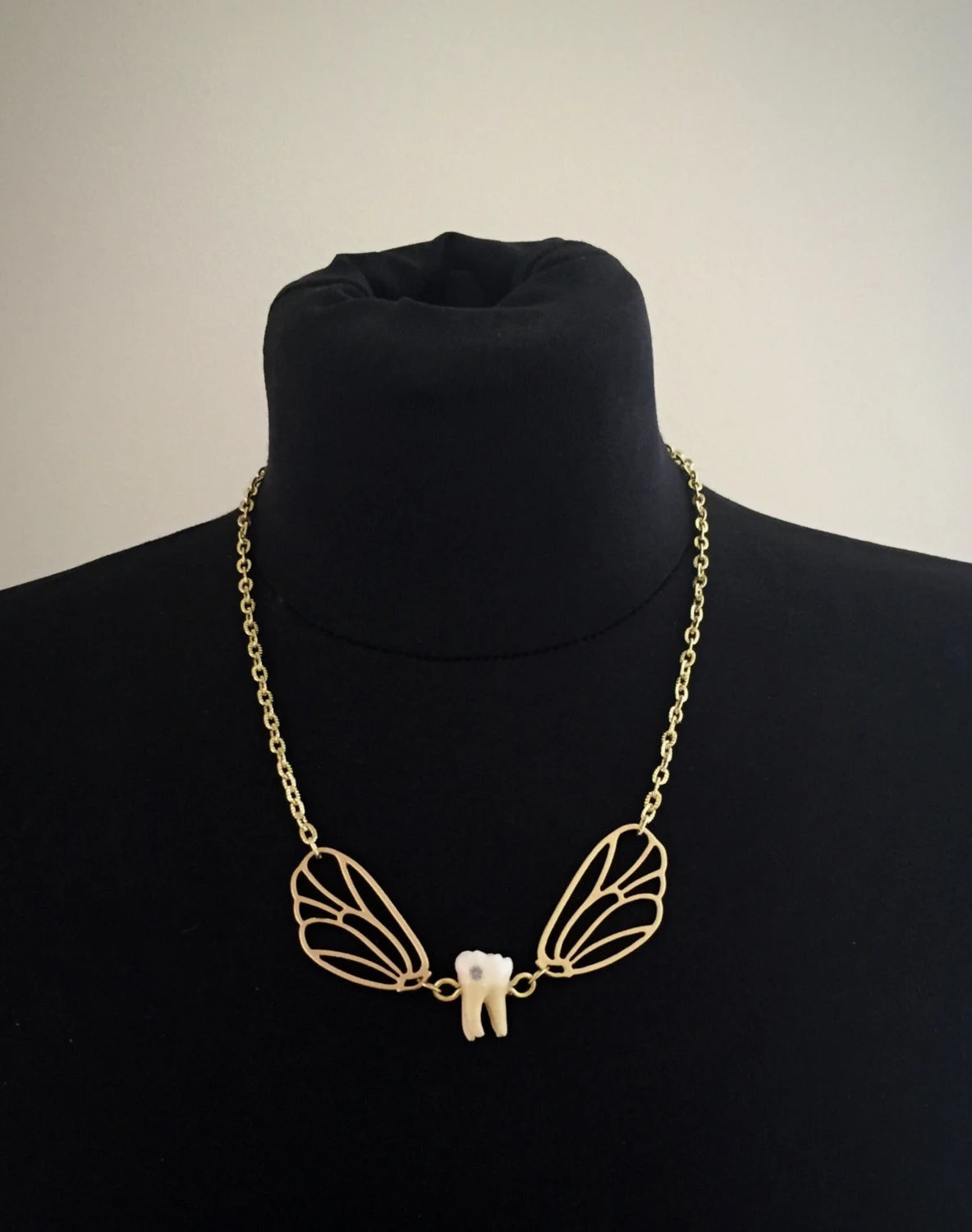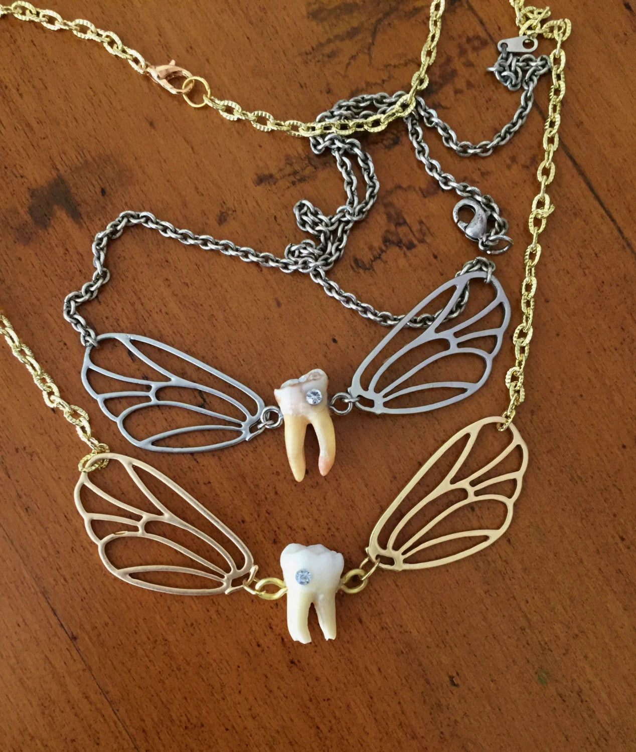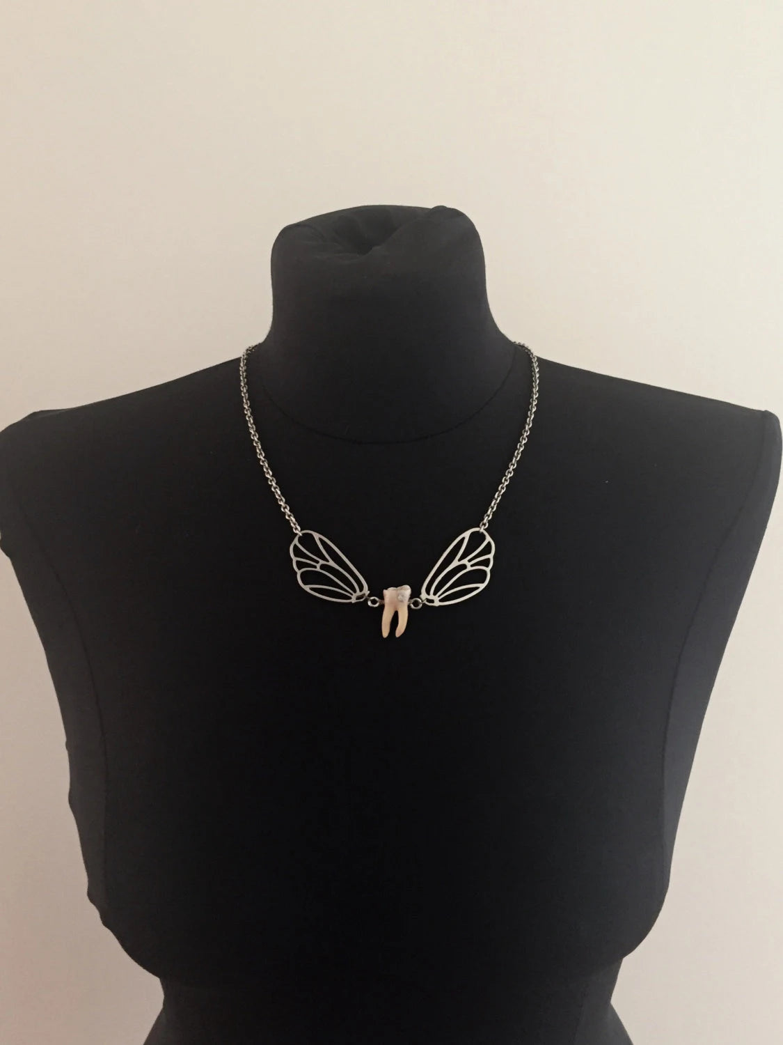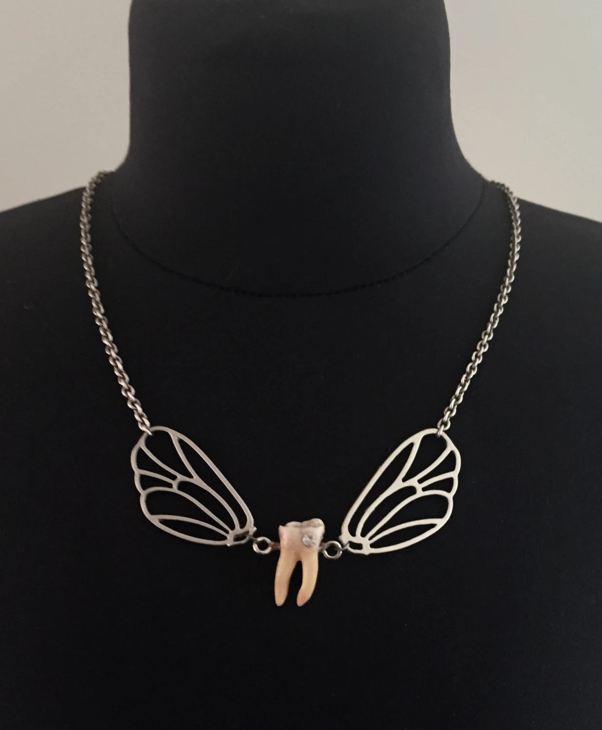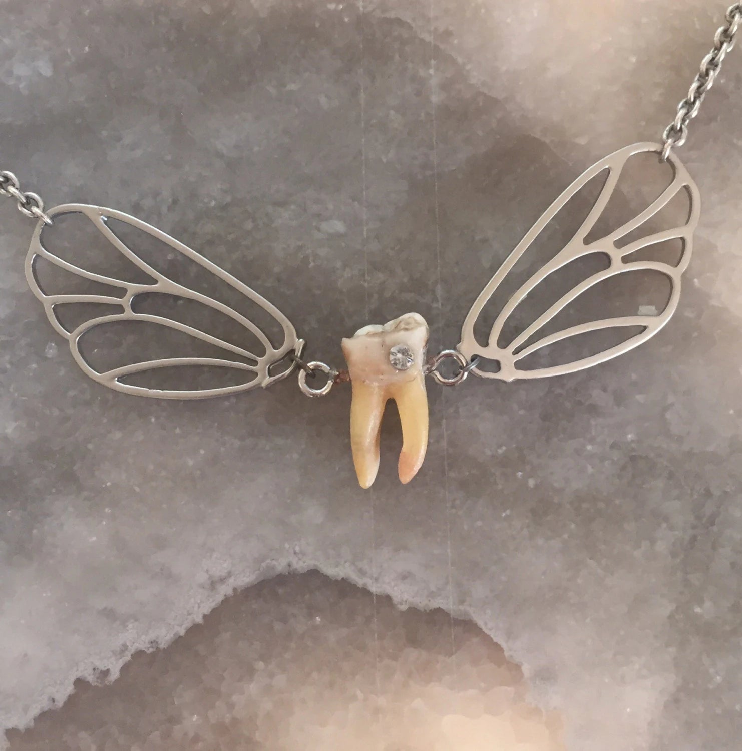 A real authentic human tooth with swarovski crystal cavity is attached to silver wings and hangs from a chain as a necklace! Super cute, unique and tooth fairy approved!