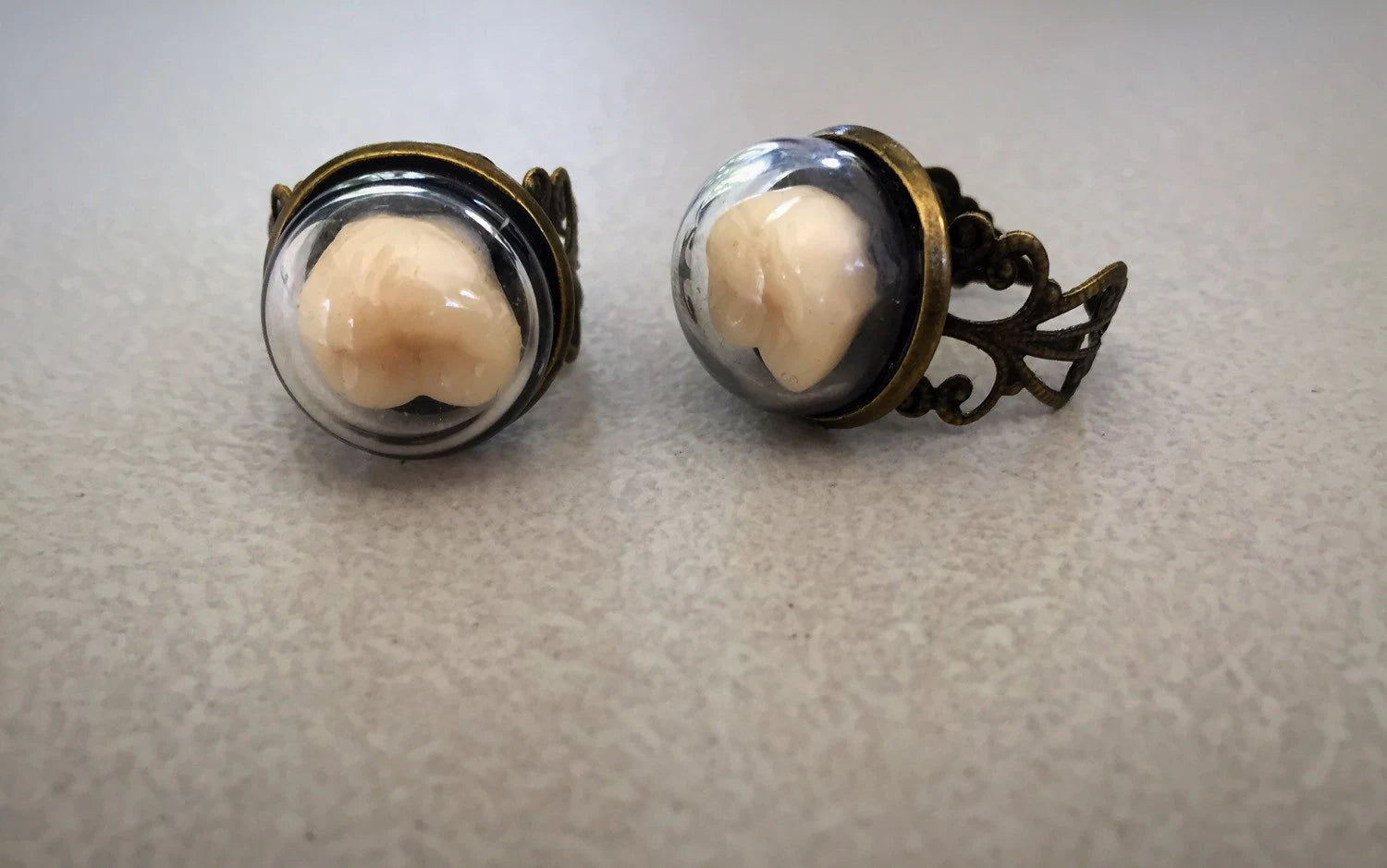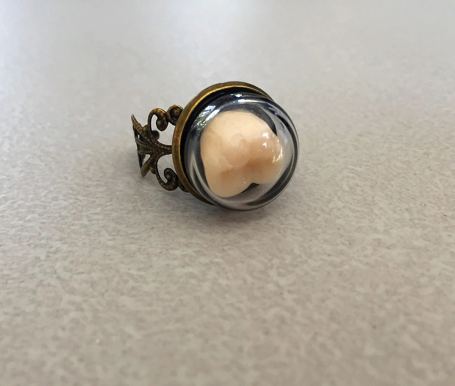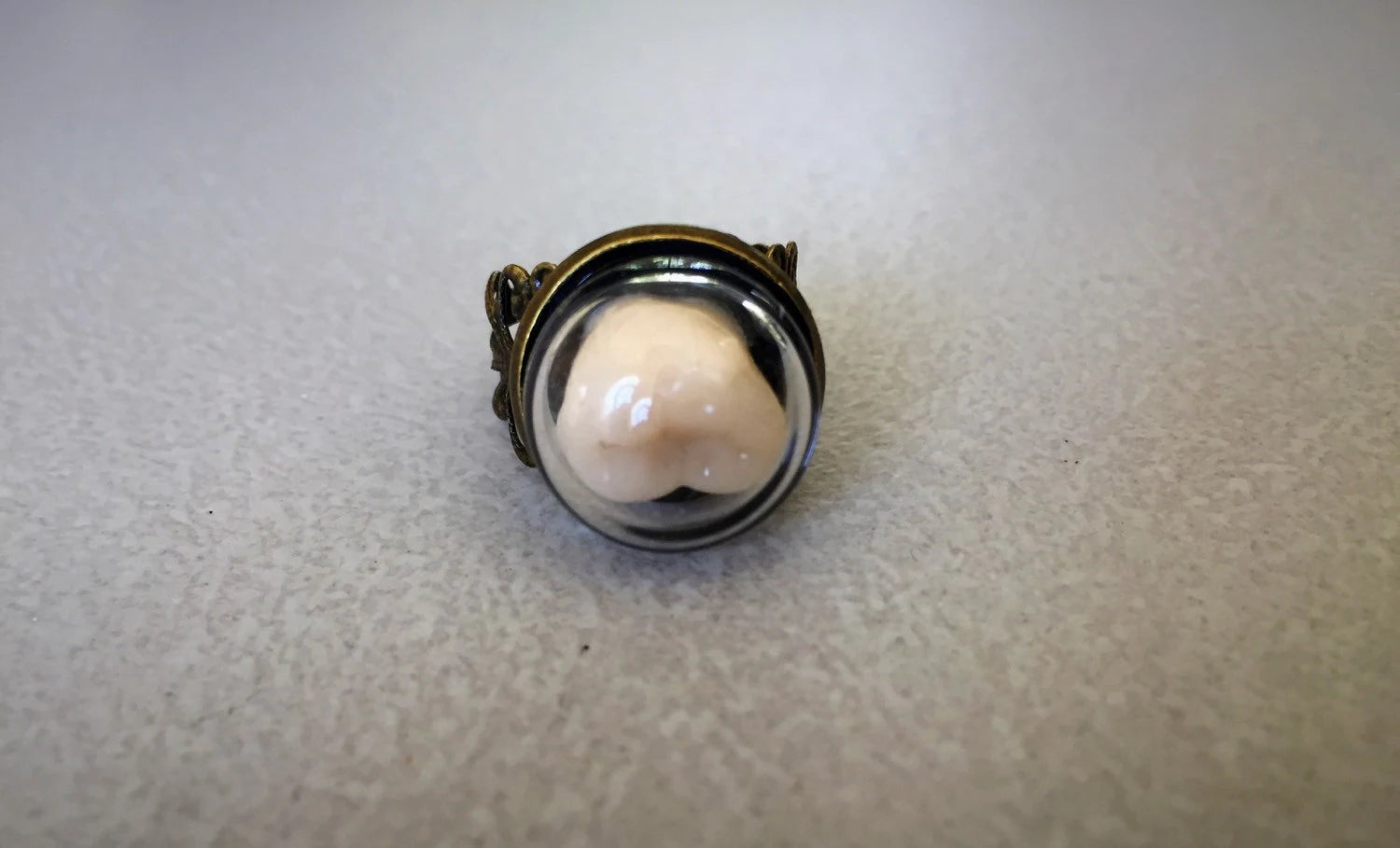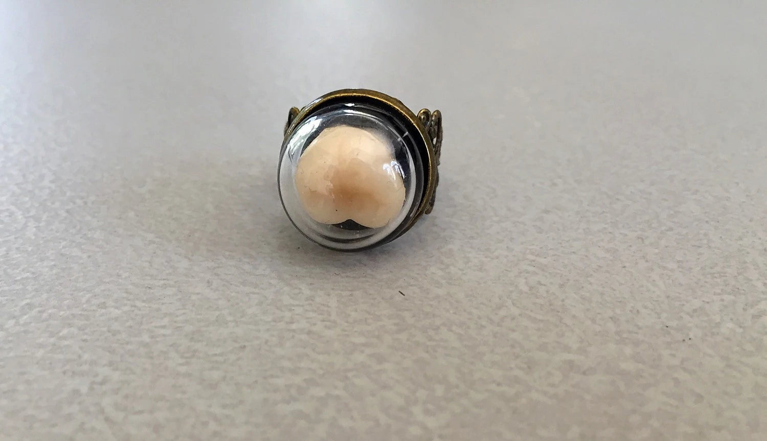 On a fancy adjustable ring is a human tooth in kept under a globed dome for safe keeping