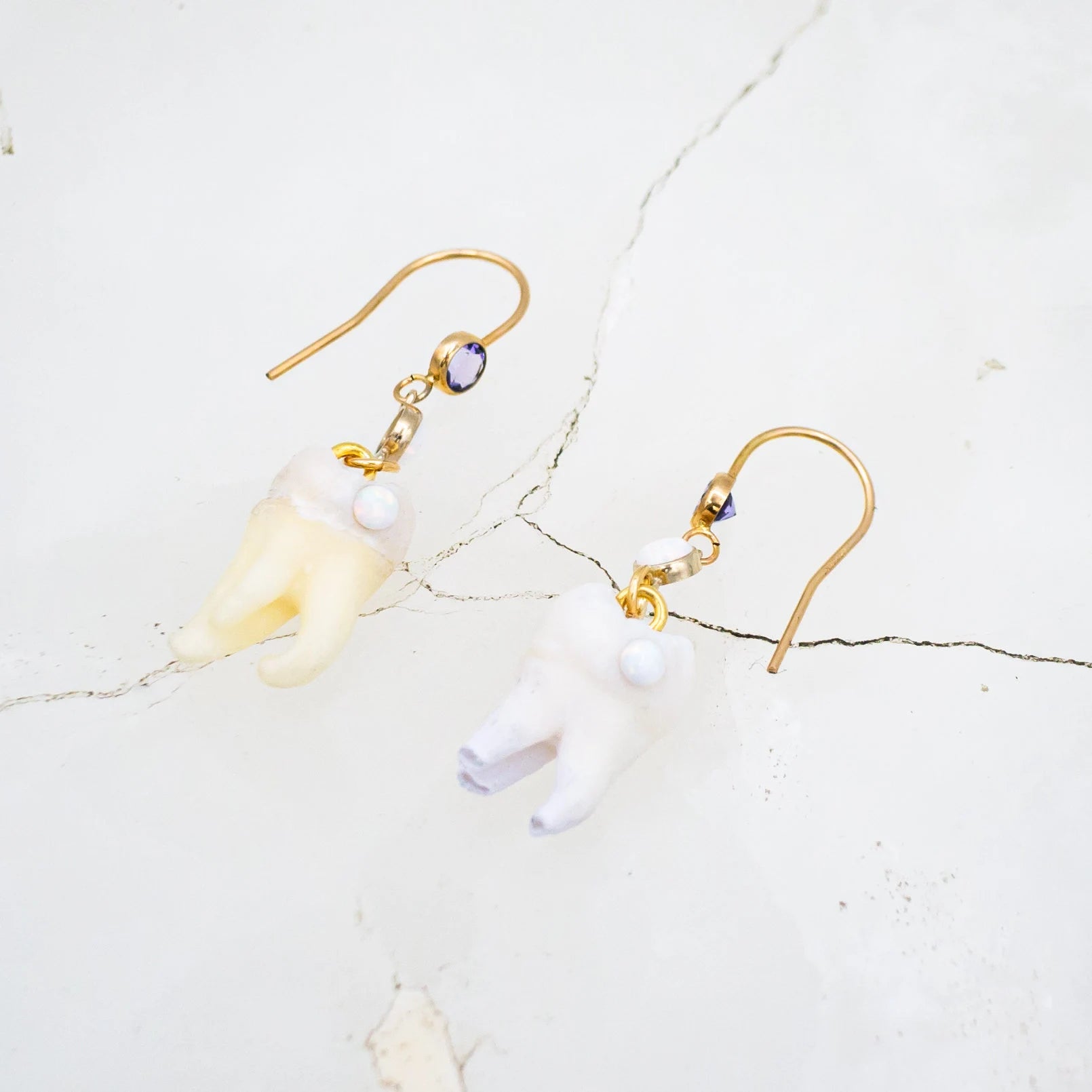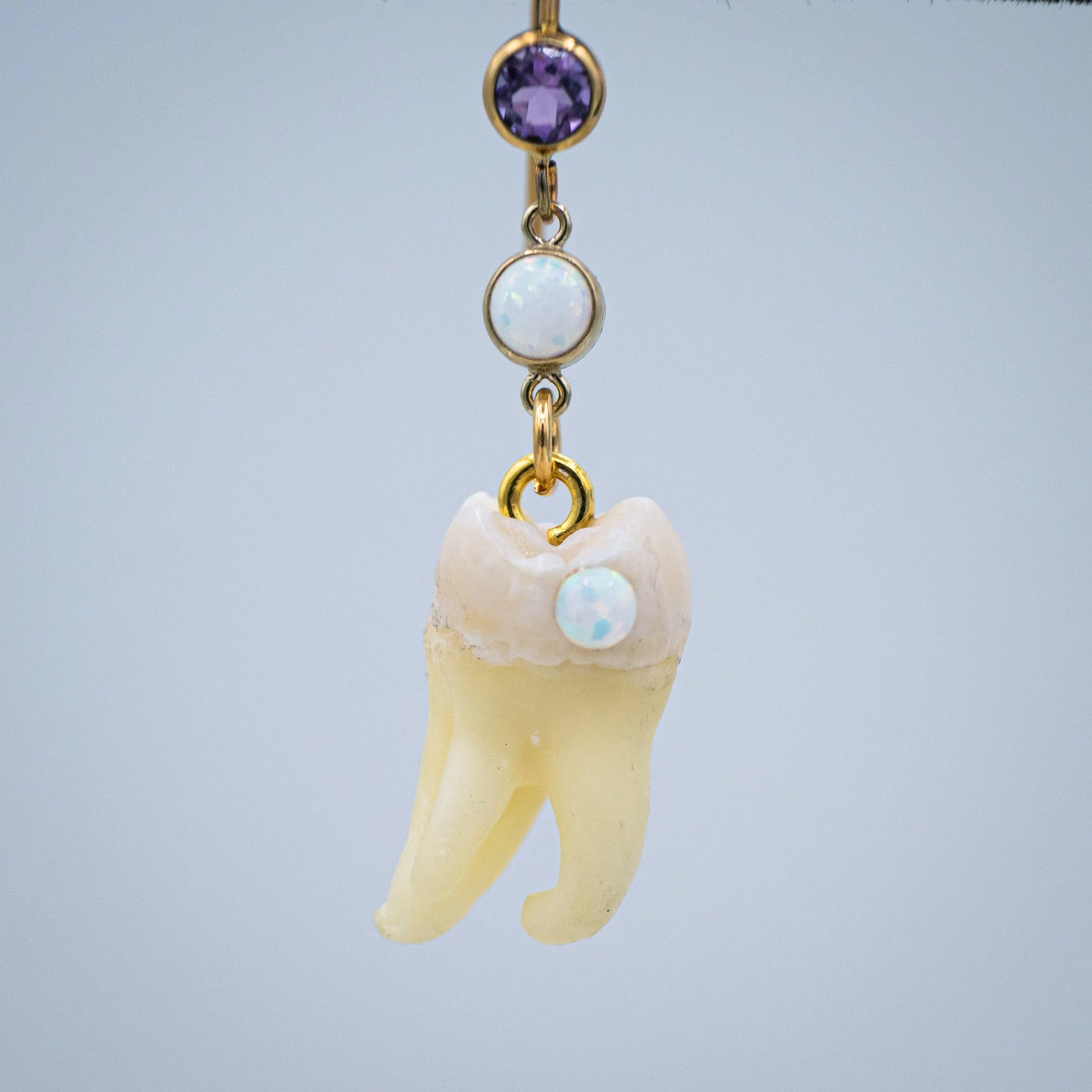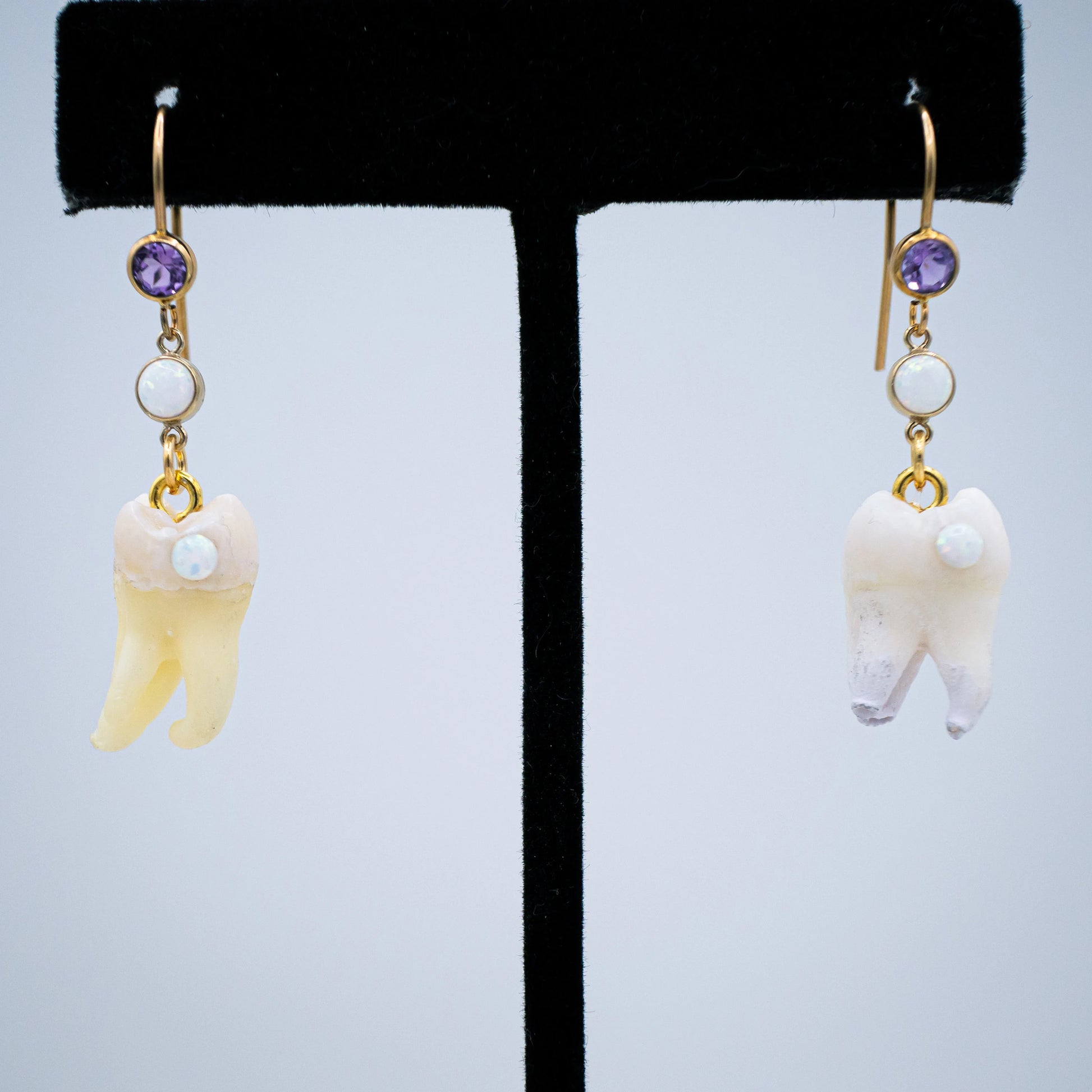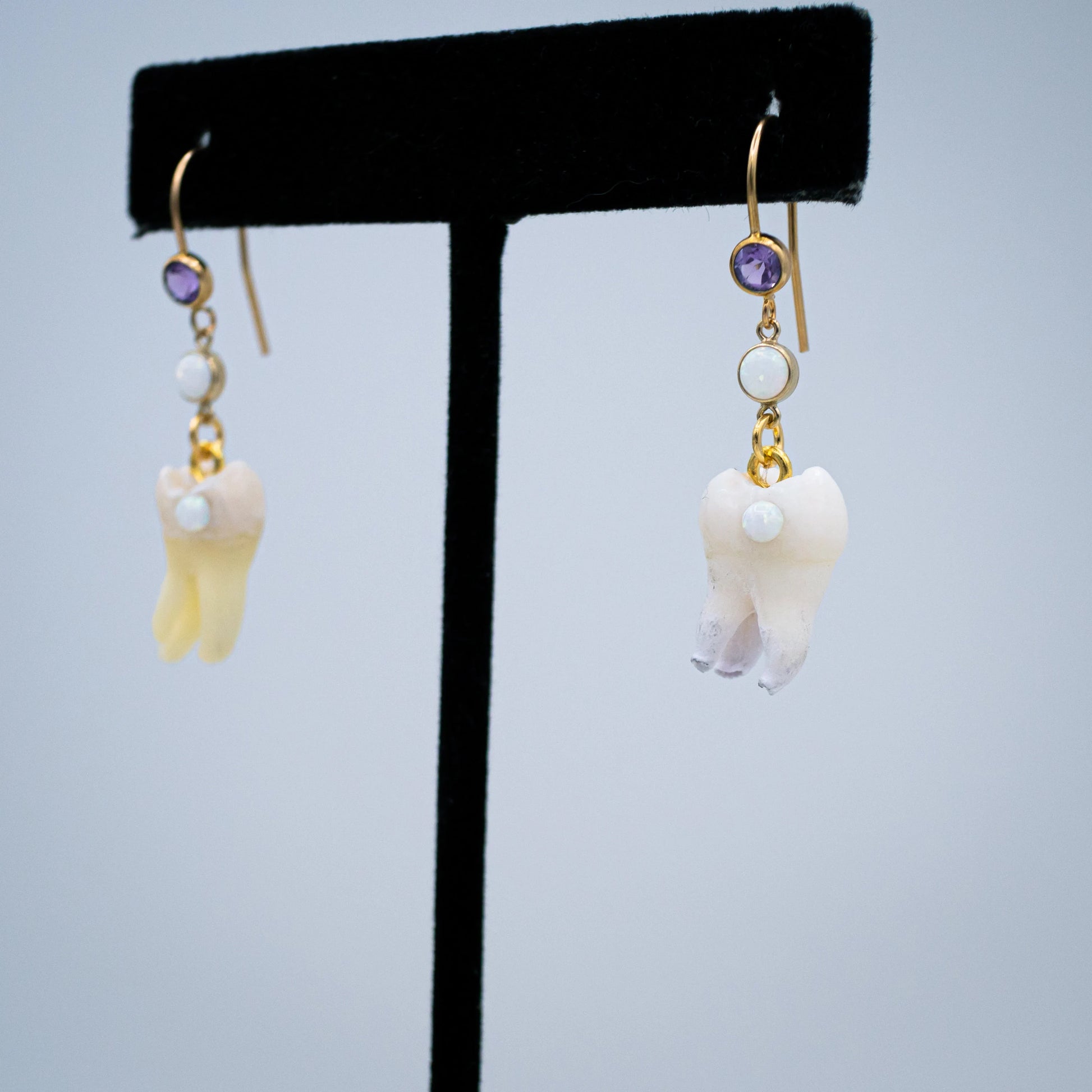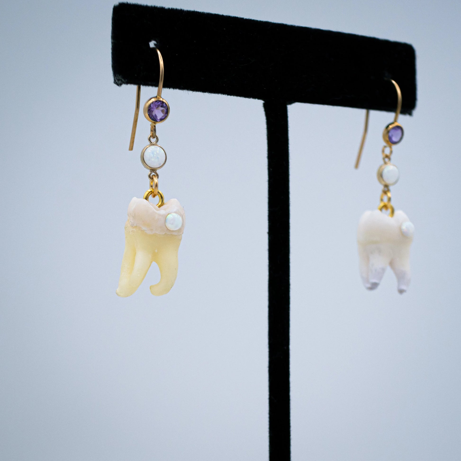 These beautiful golden earring hooks adorned with a purple glass crystal dangle a genuine gold set Opal underneath from which hangs a Genuine Human Molar with a matching Opal Cavity gemstone.