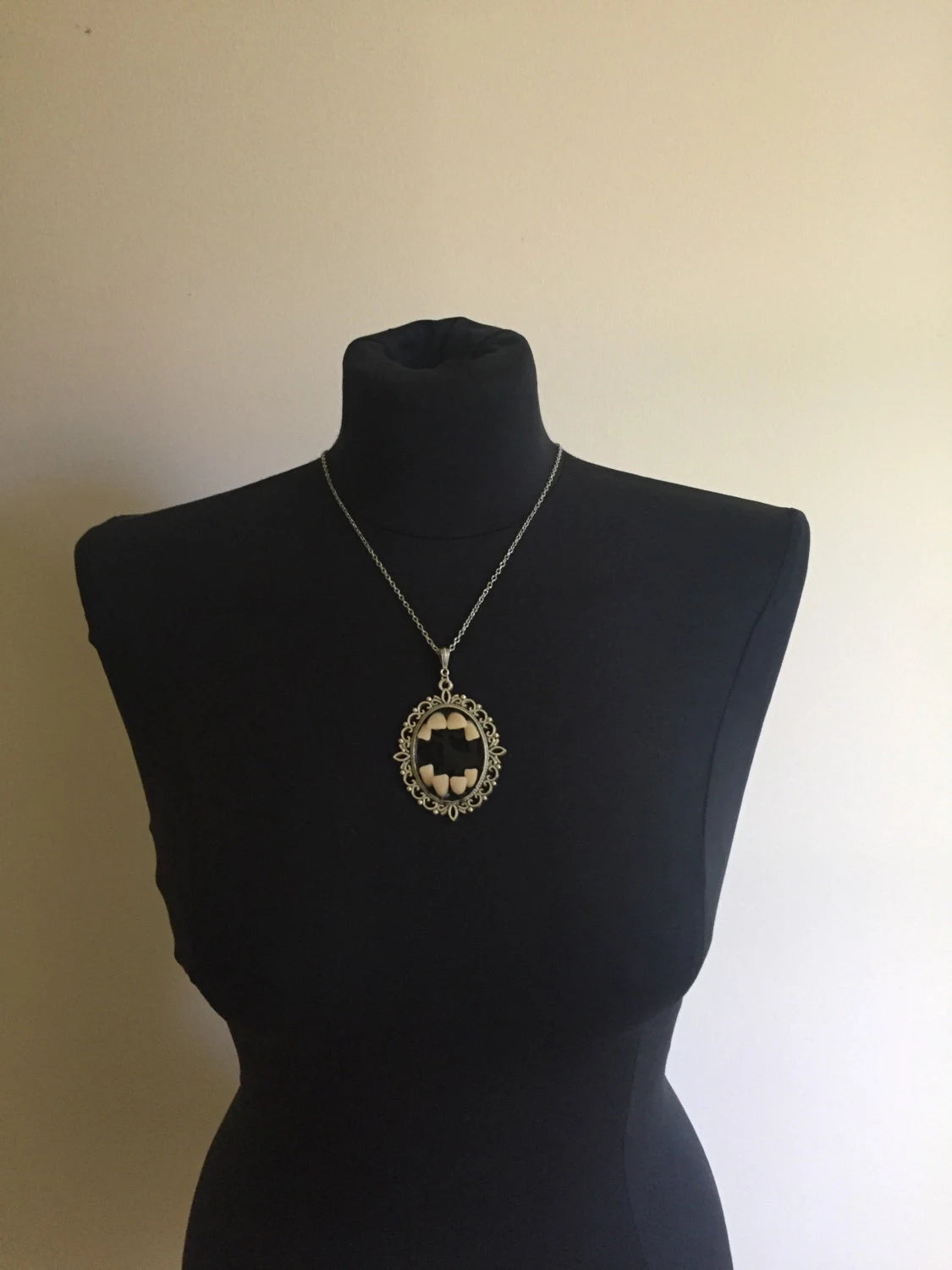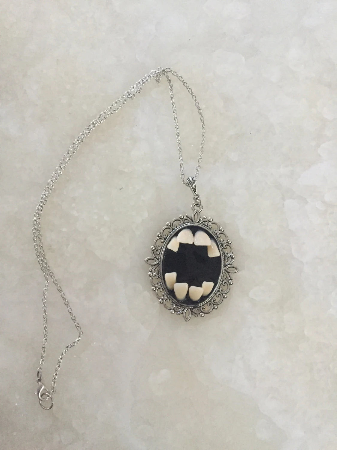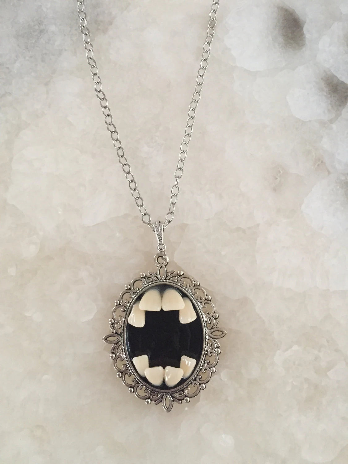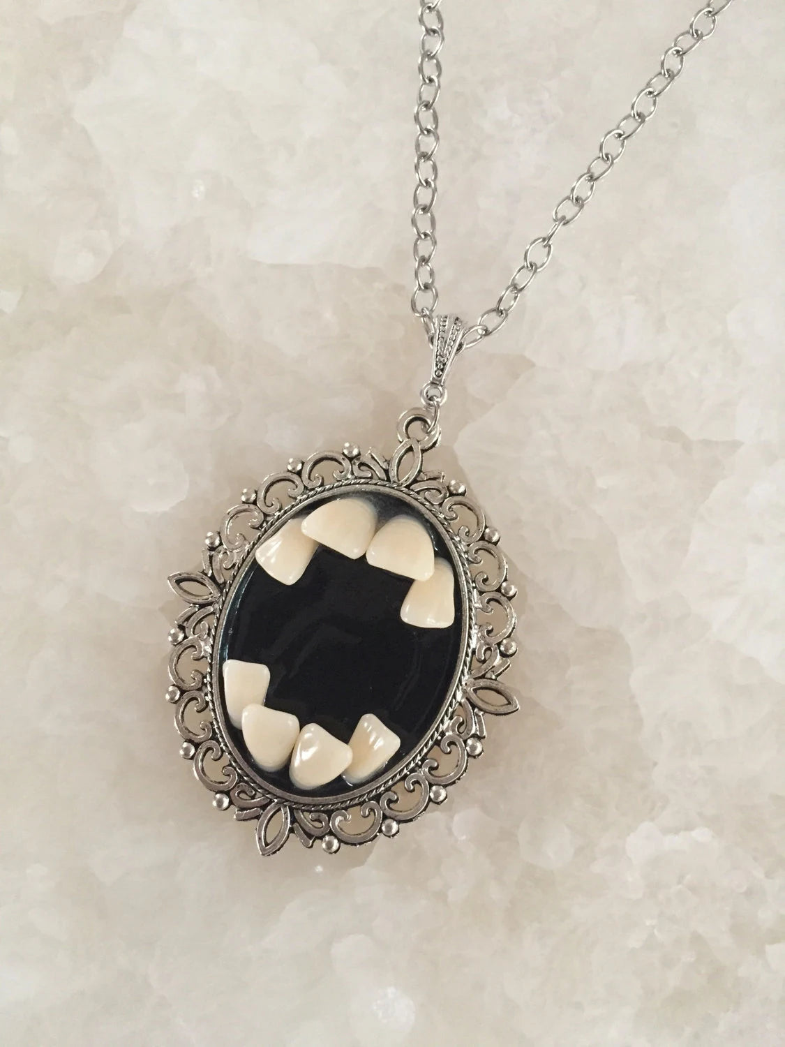 Eight, acrylic pearly whites bite threw the center of this silver setting.