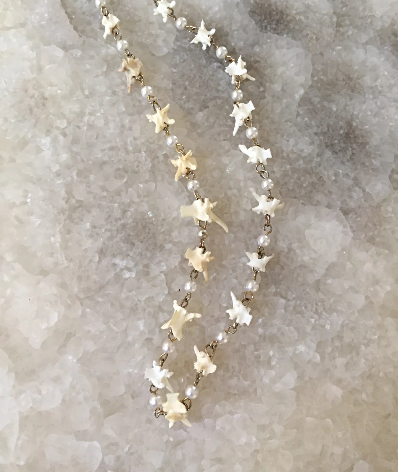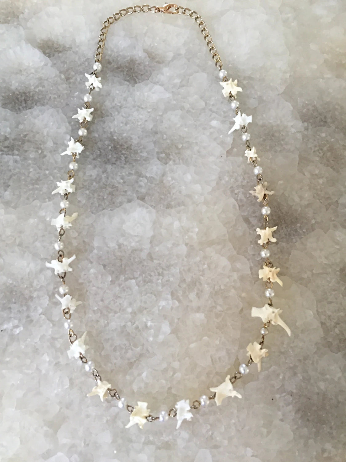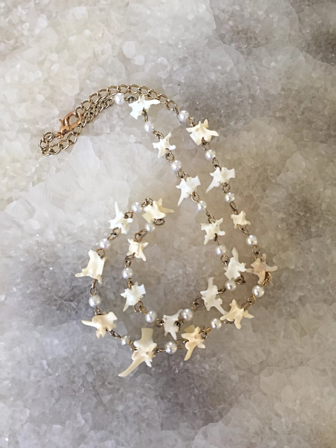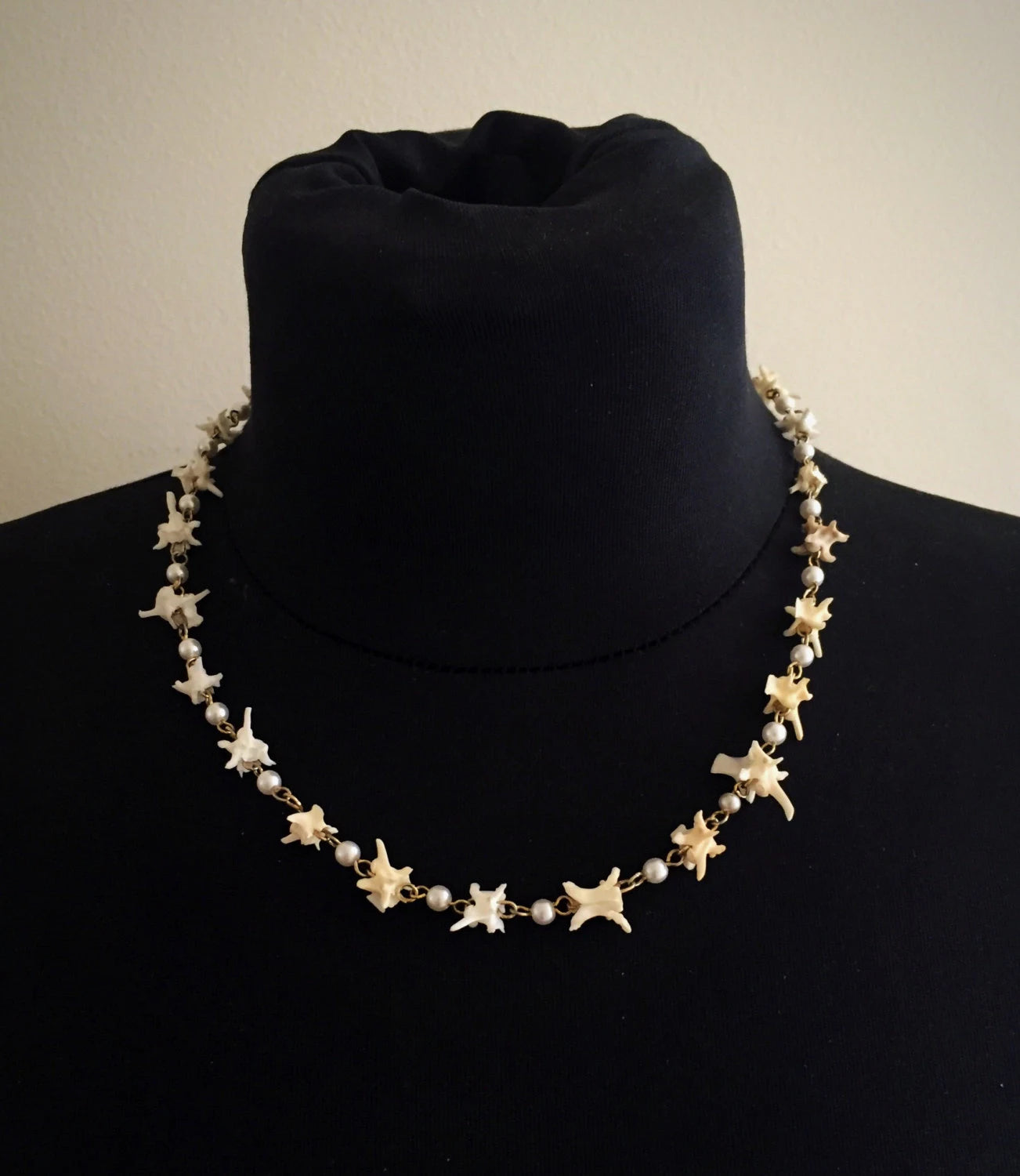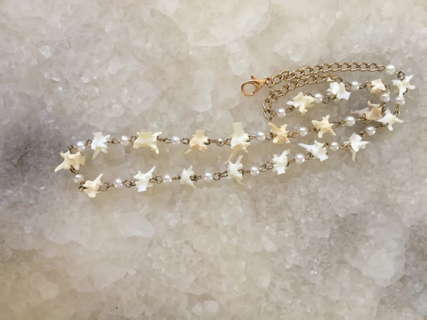 This versatile piece is made of rattle snake vertebrae and faux pearls linked together by hand. It can be worn as a choker, a necklace or a double strand bracelet
