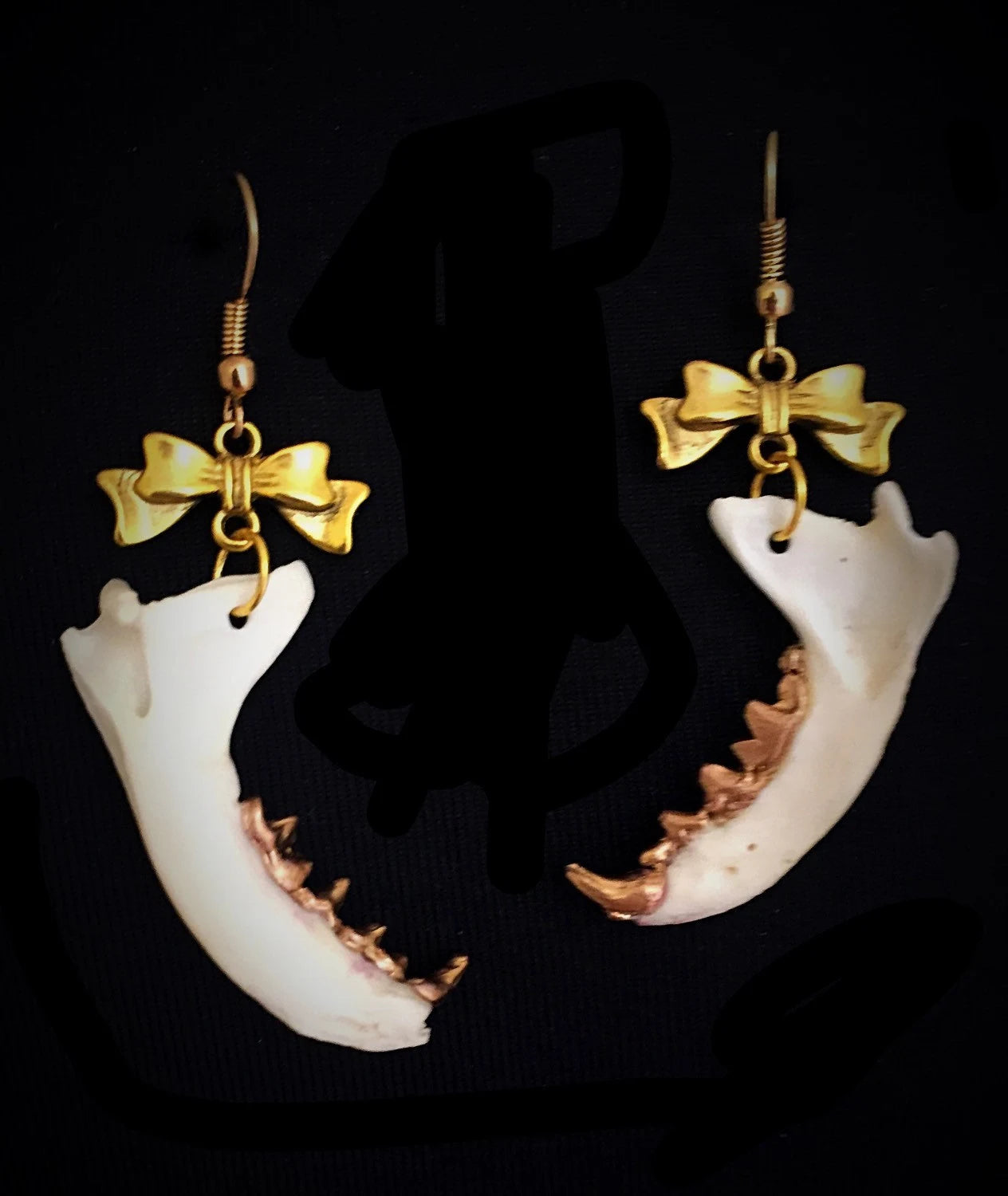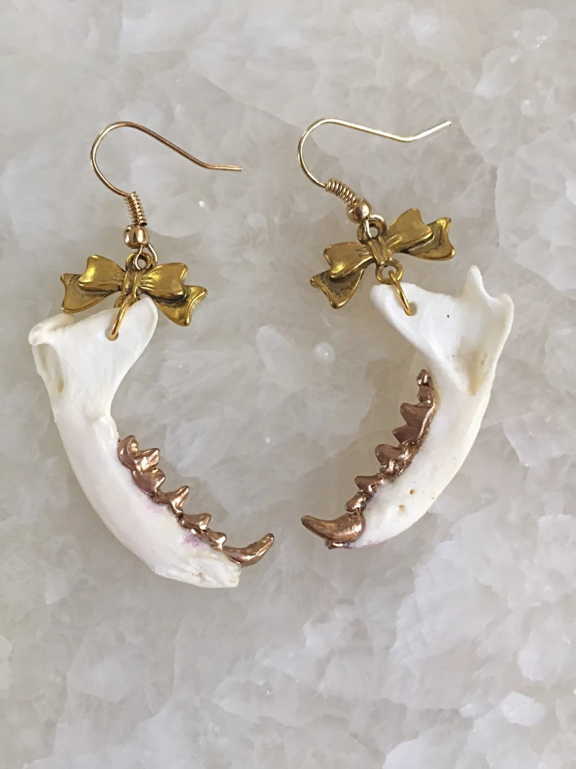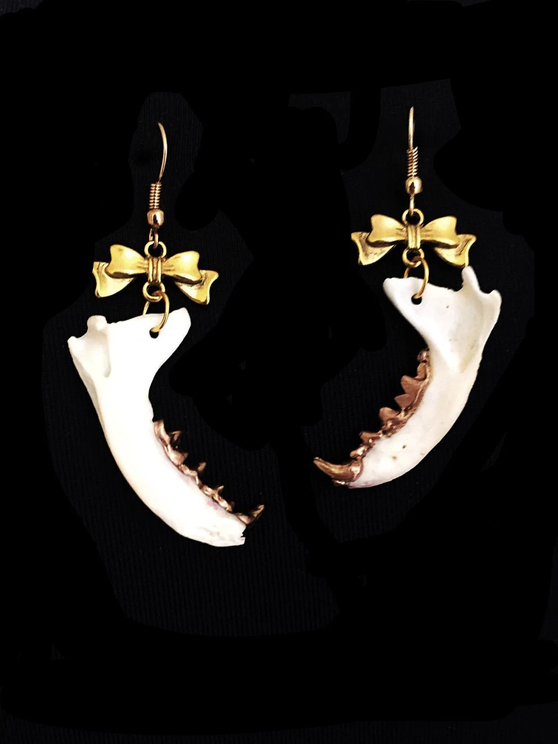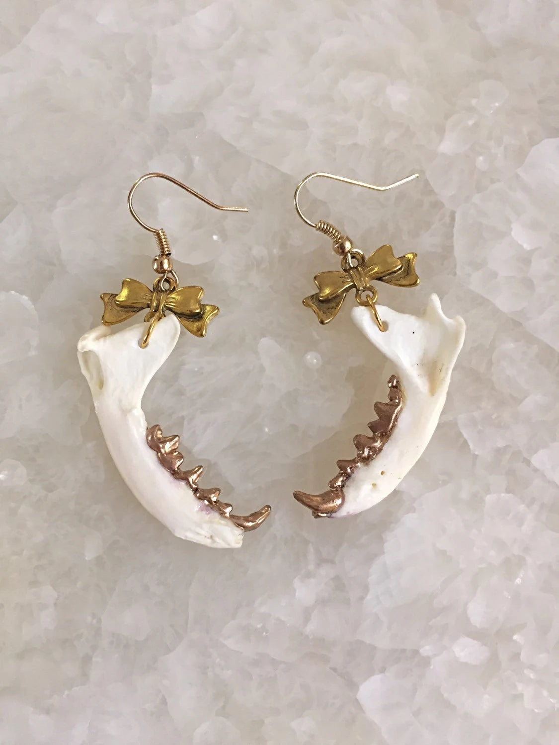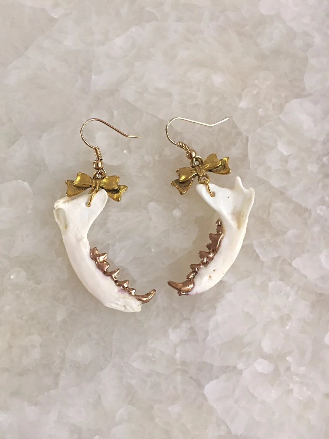 Authentic mink jaws have gilded gold teeth and hang from adorable bow charms on earring hooks