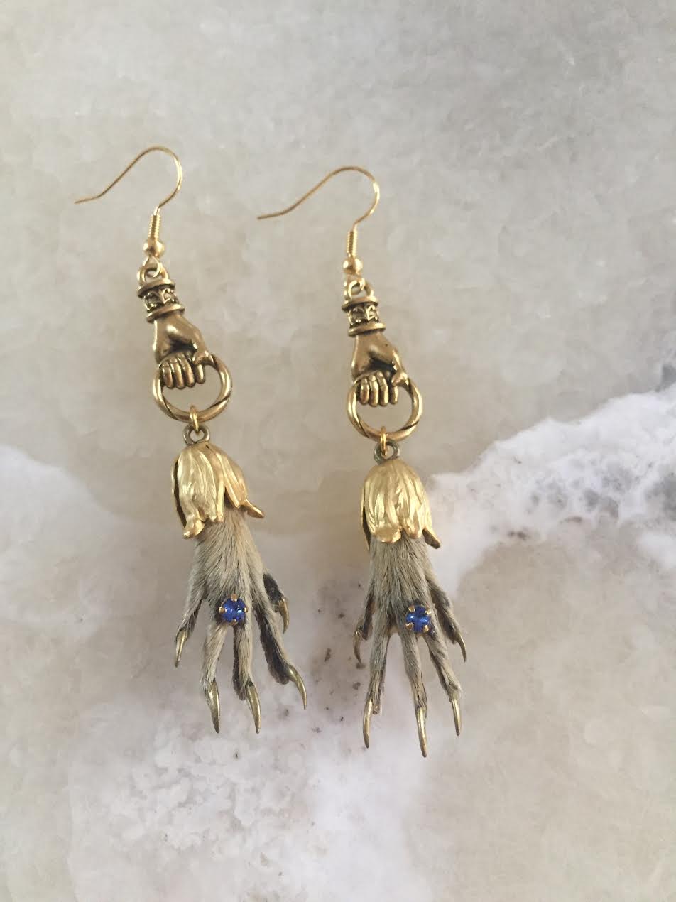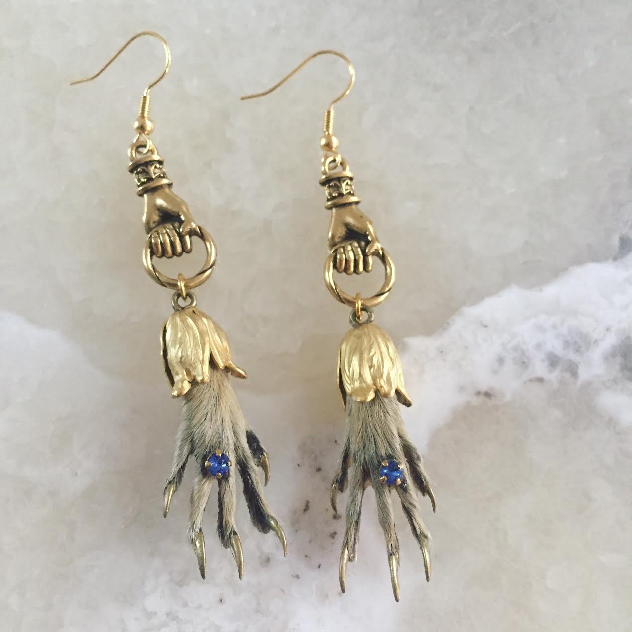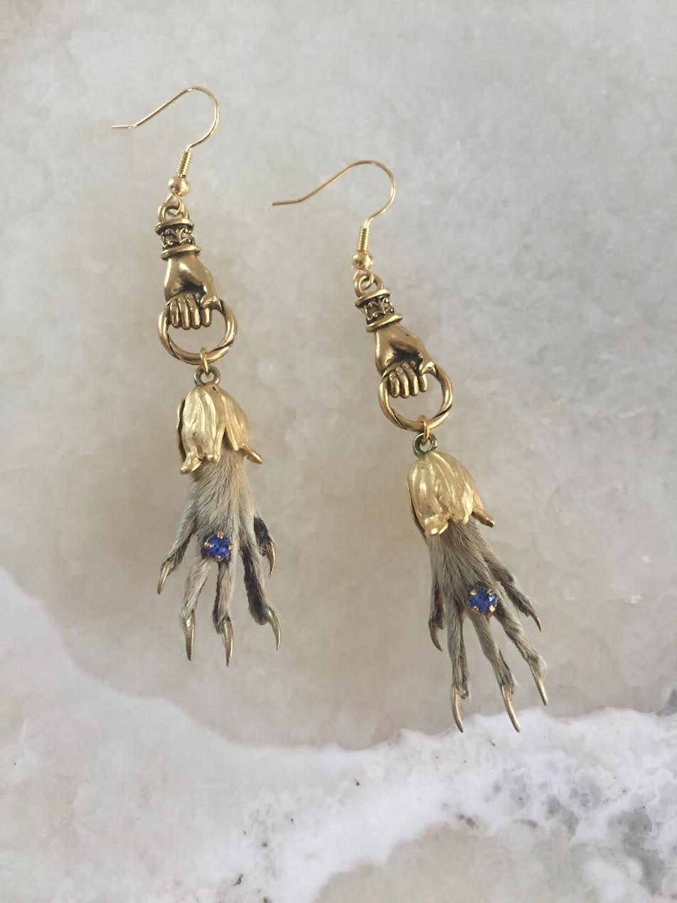 From gold or silver hands hang taxidermy paws that wear stone rings and painted nails as unique earrings