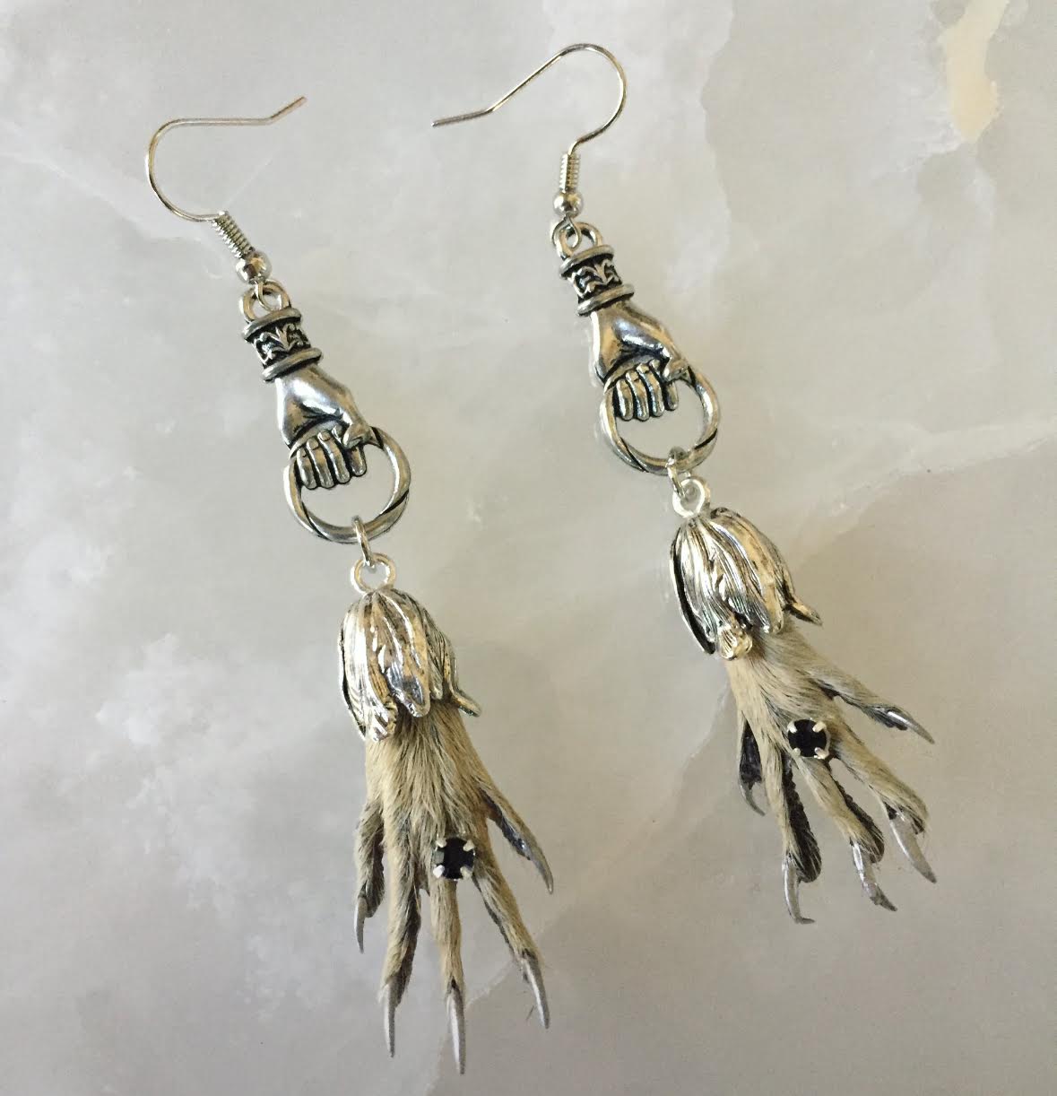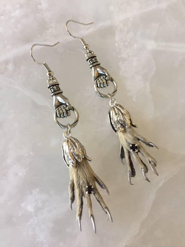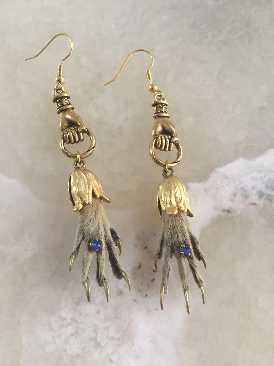 From gold or silver hands hang taxidermy paws that wear stone rings and painted nails as unique earrings