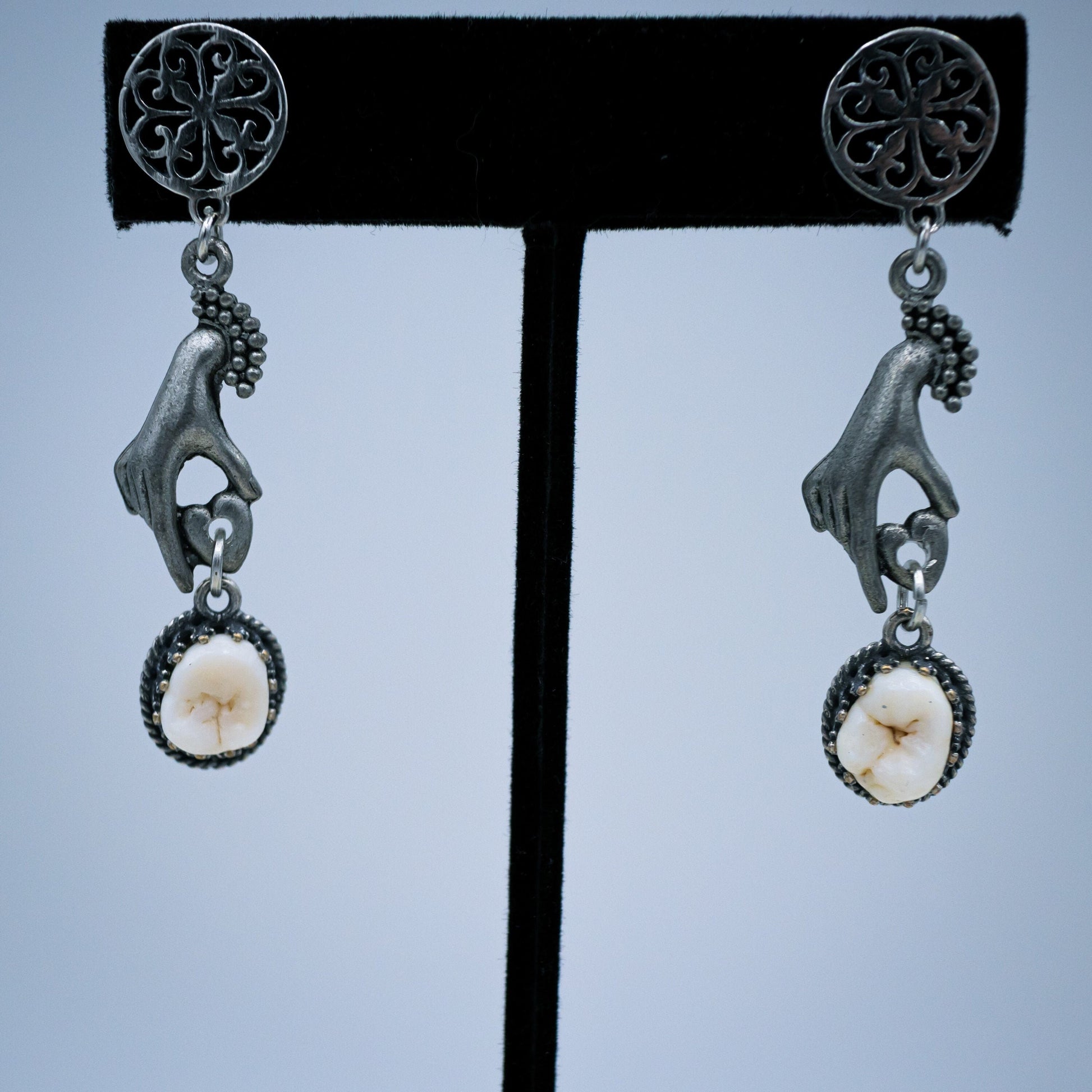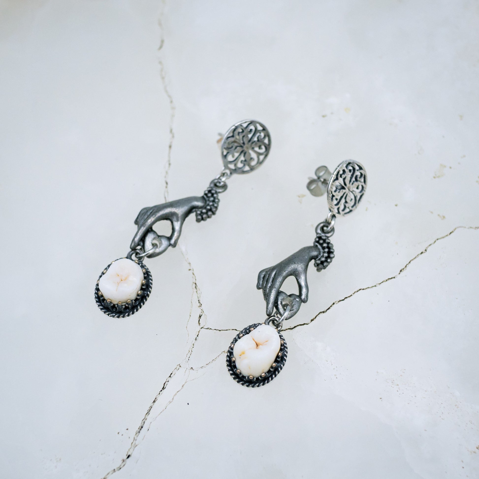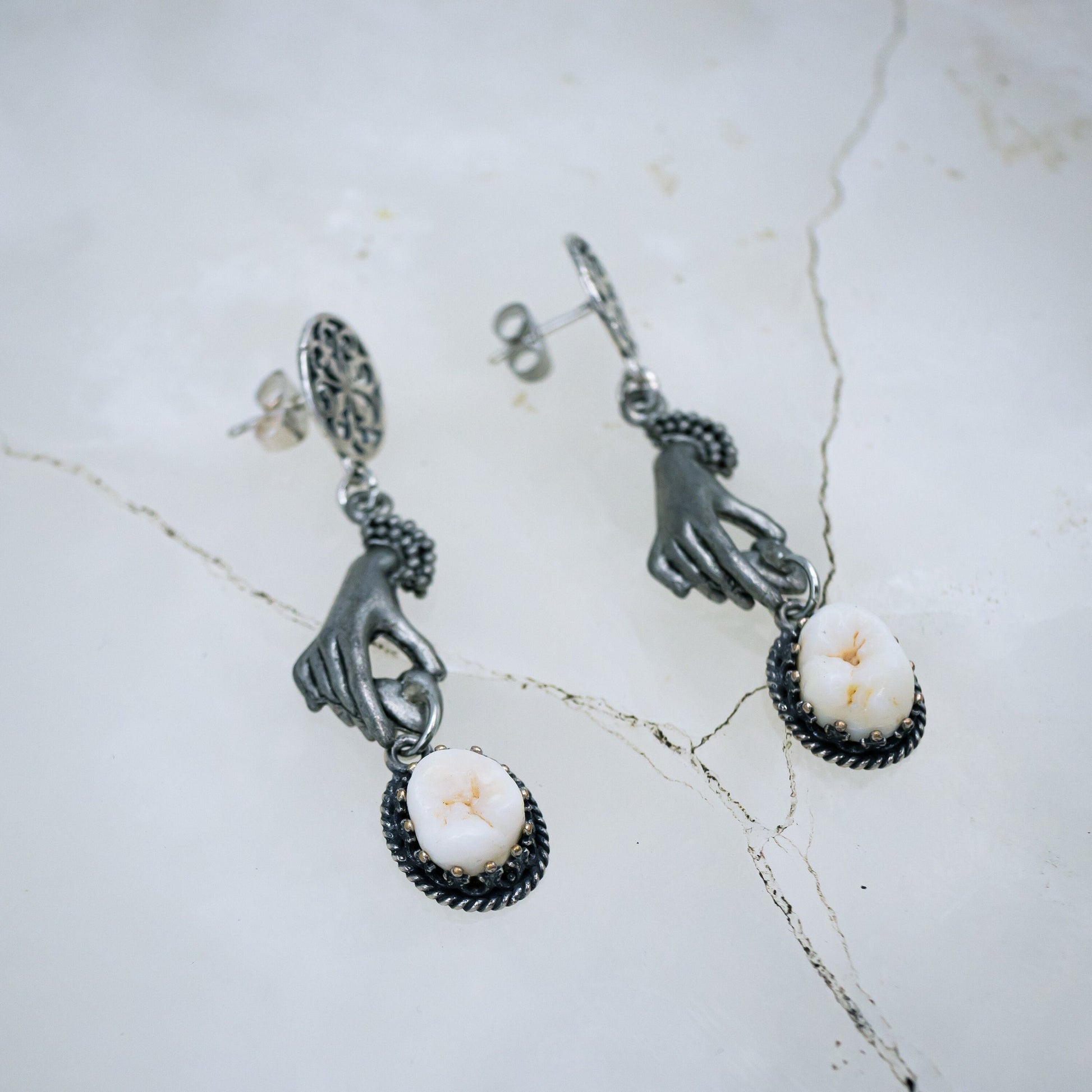 Authentic human molars are set in sterling silver bezel settings and hang from silver hands by ornate stud earrings