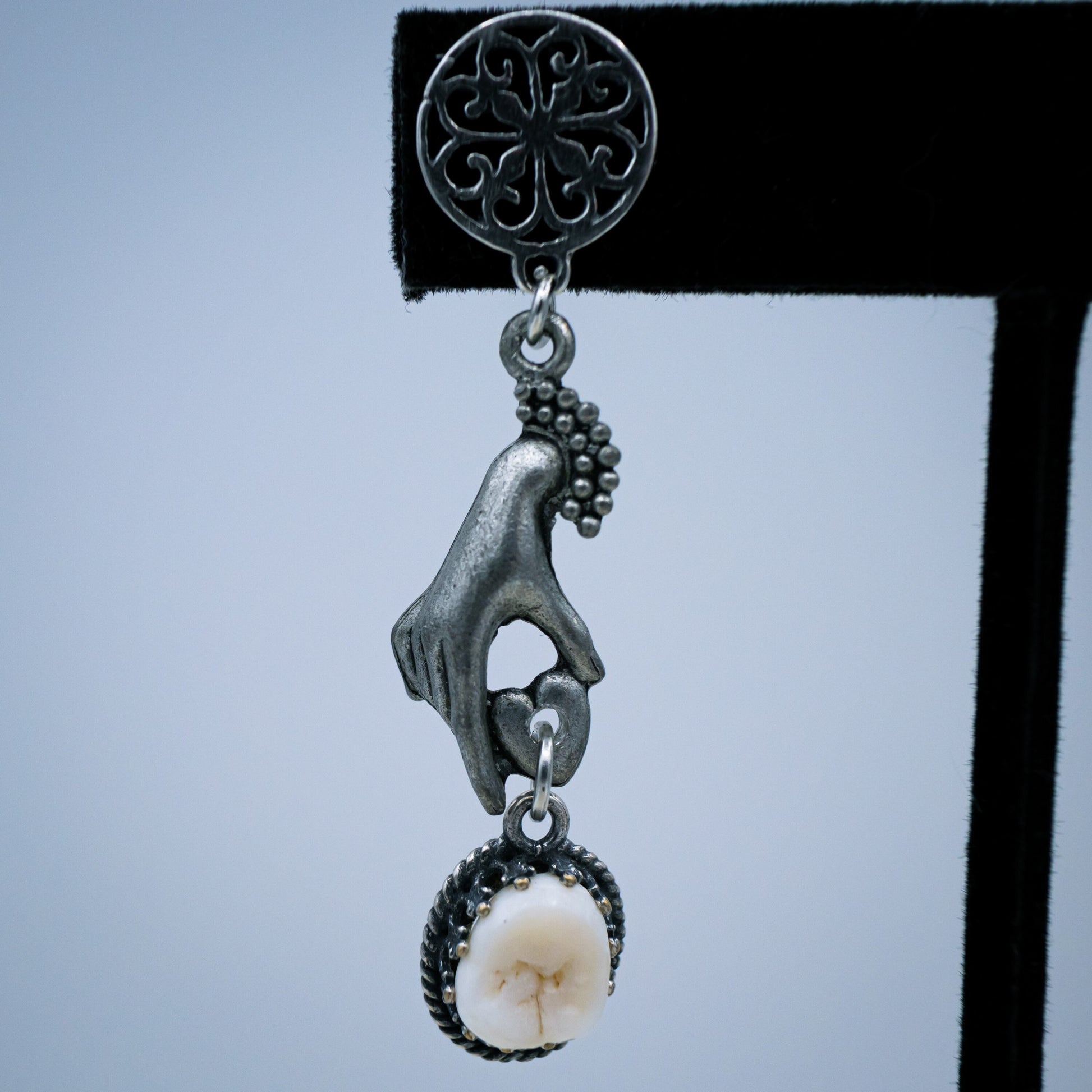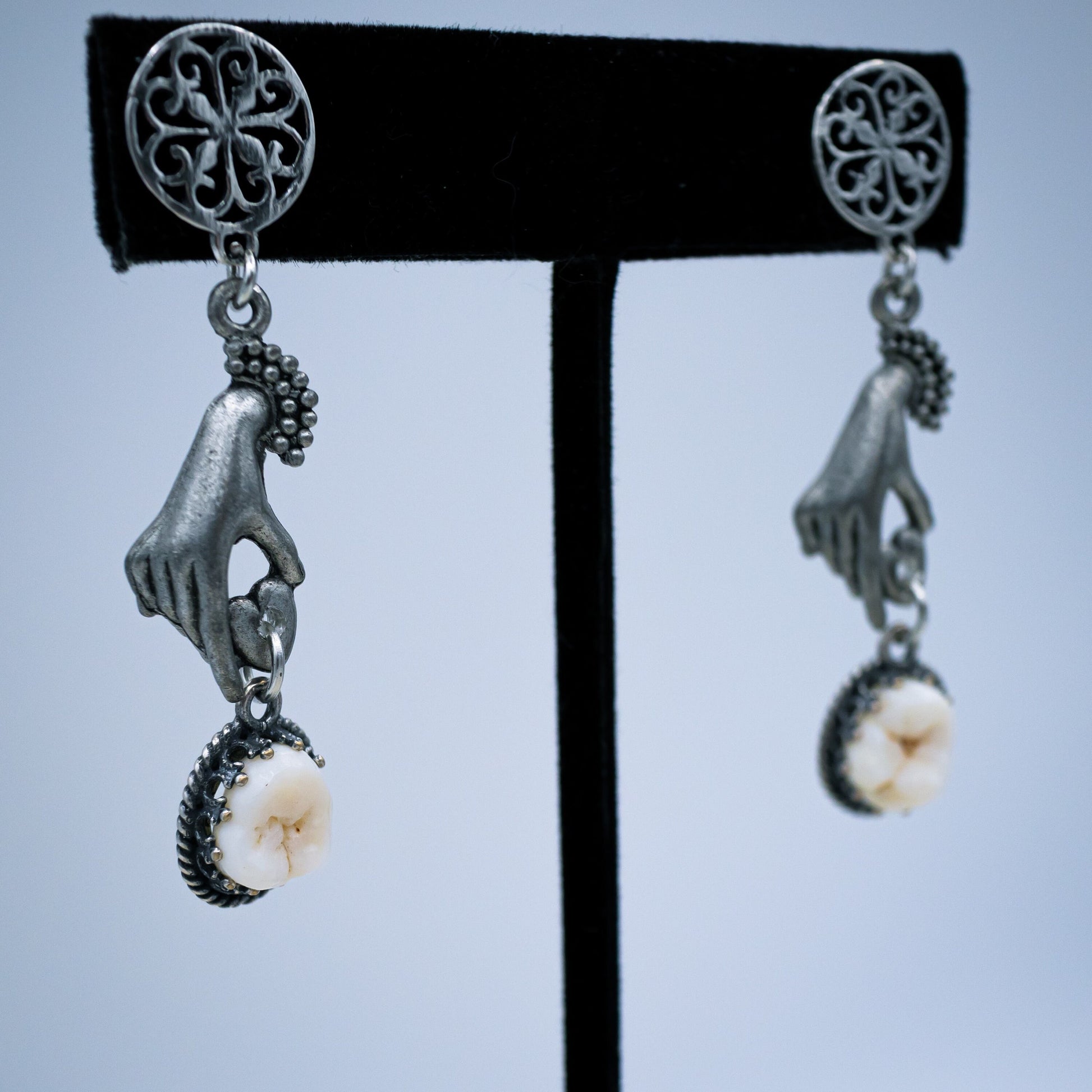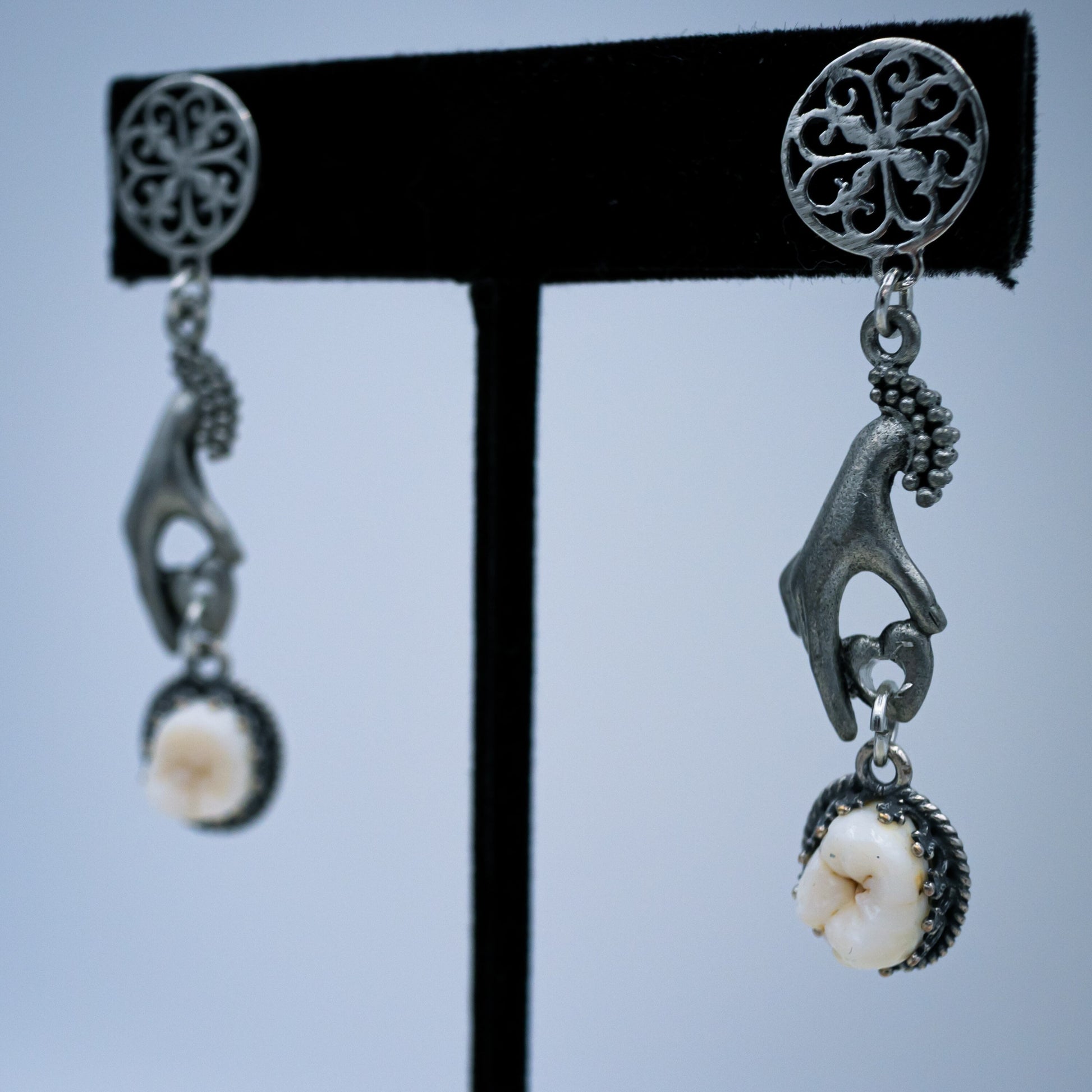 Authentic human molars are set in sterling silver bezel settings and hang from silver hands by ornate stud earrings