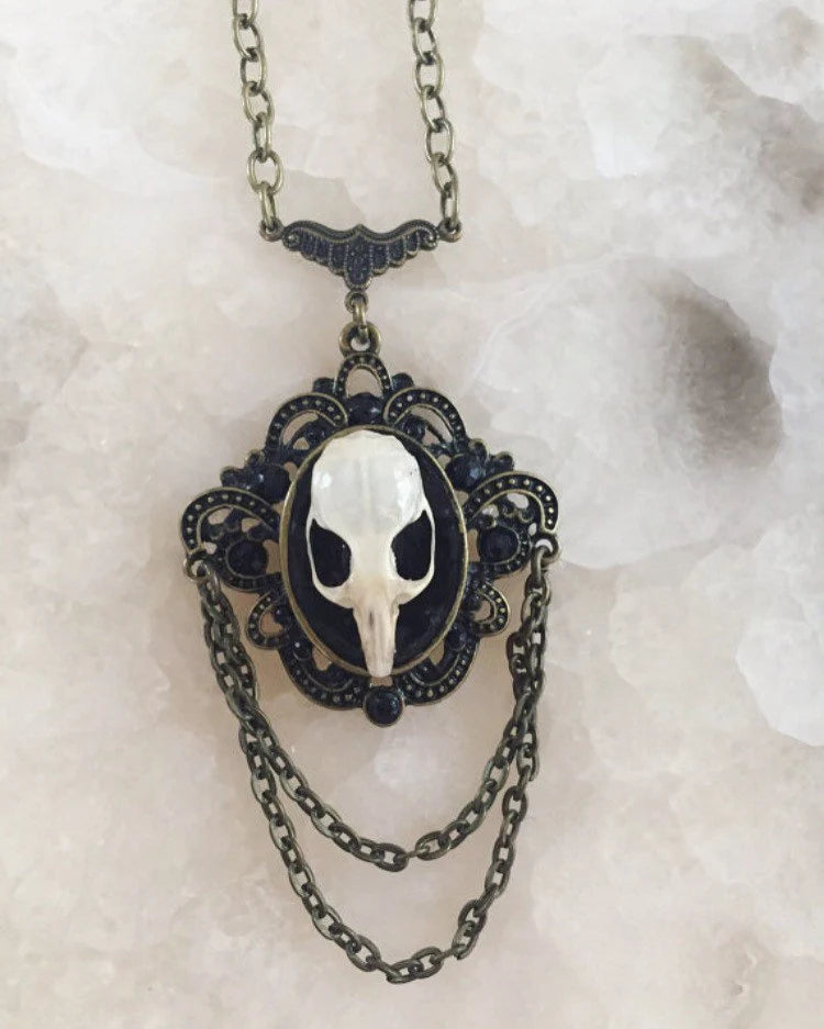 This unique Victorian inspired necklace is made from brass chain that center a fancy setting featuring an authentic mouse skull