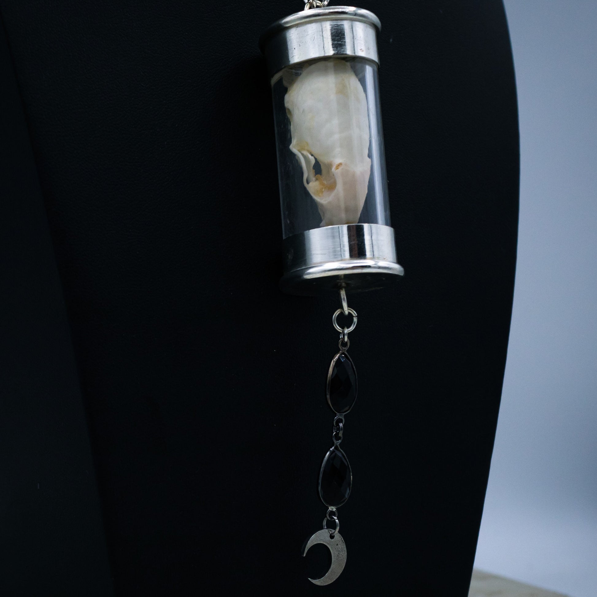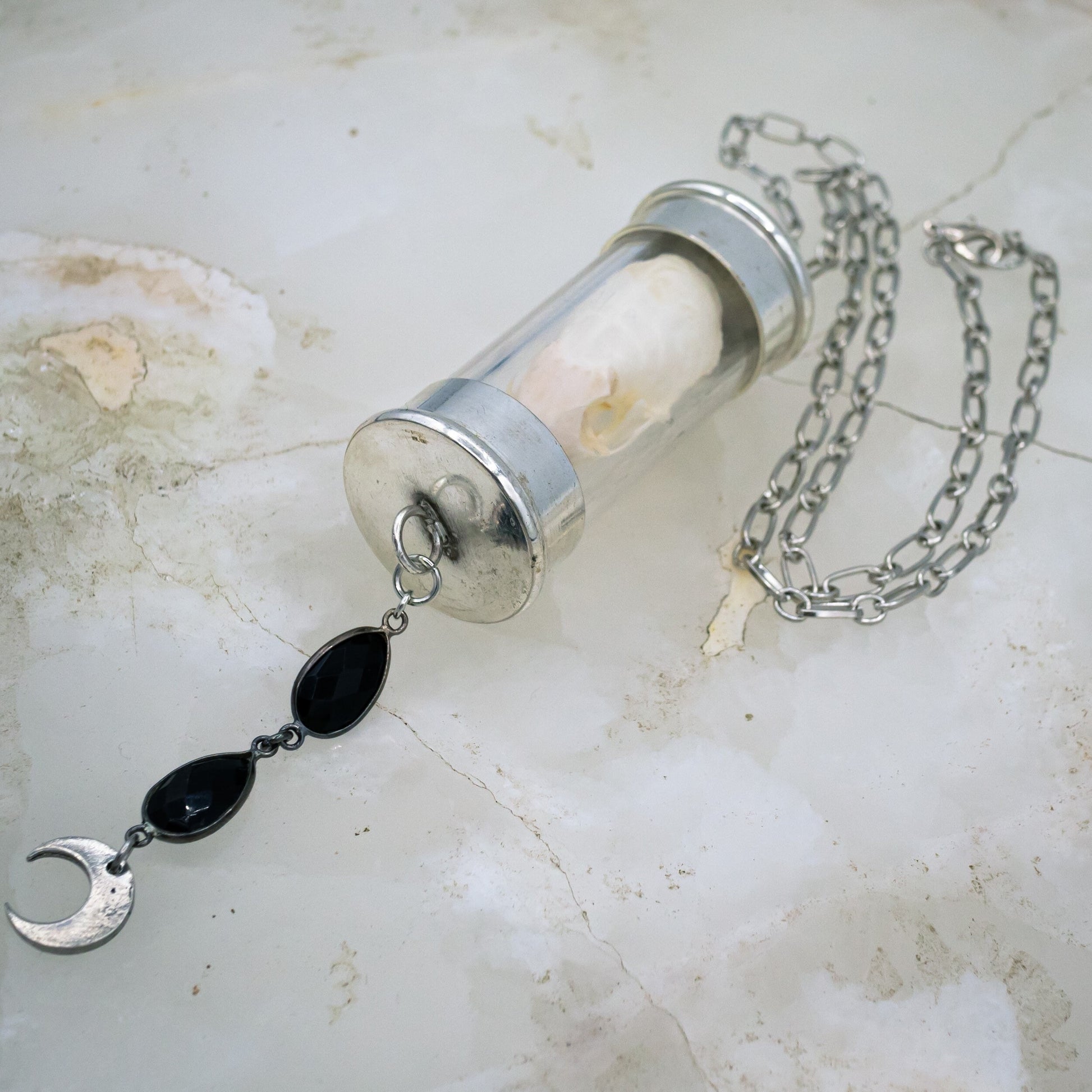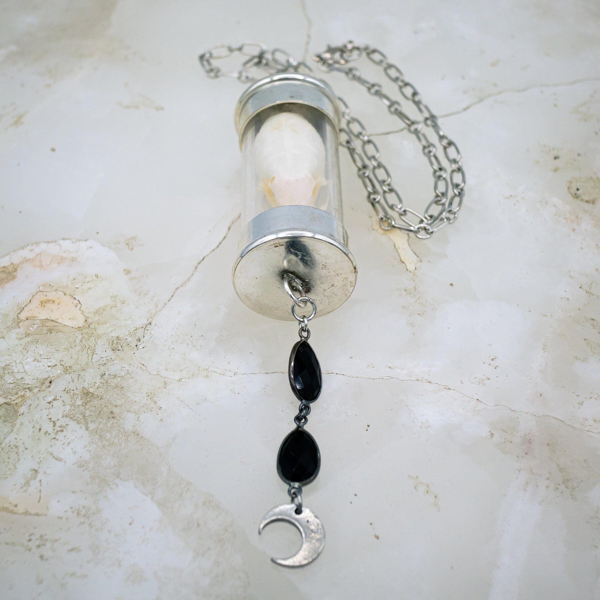 This large vial hangs from a silver chain and holds a genuine weasel skull with dangling black stone teardrops with a silver crescent moon