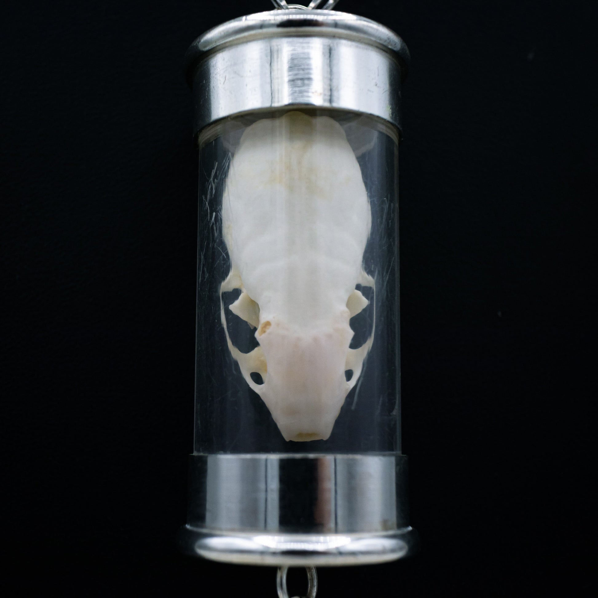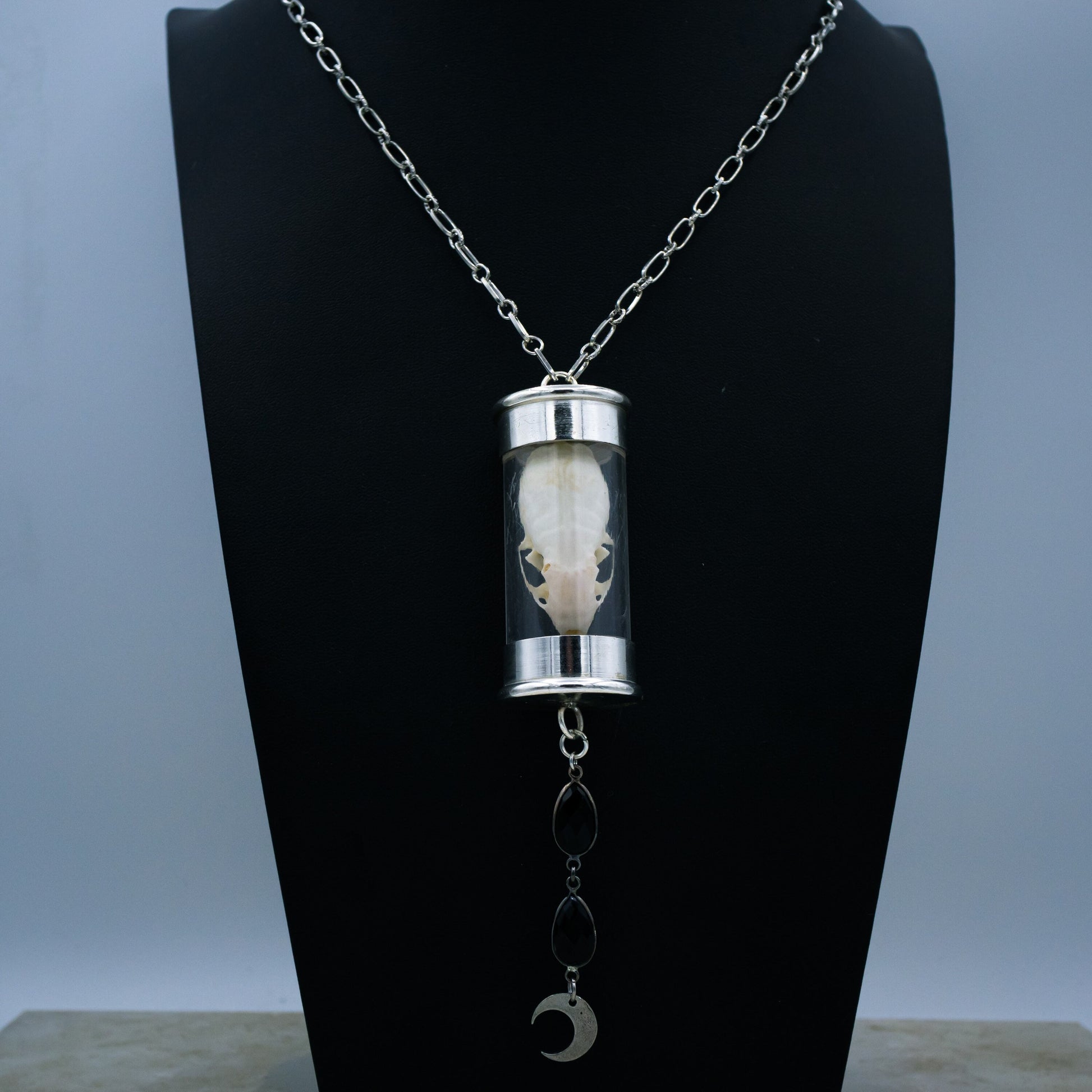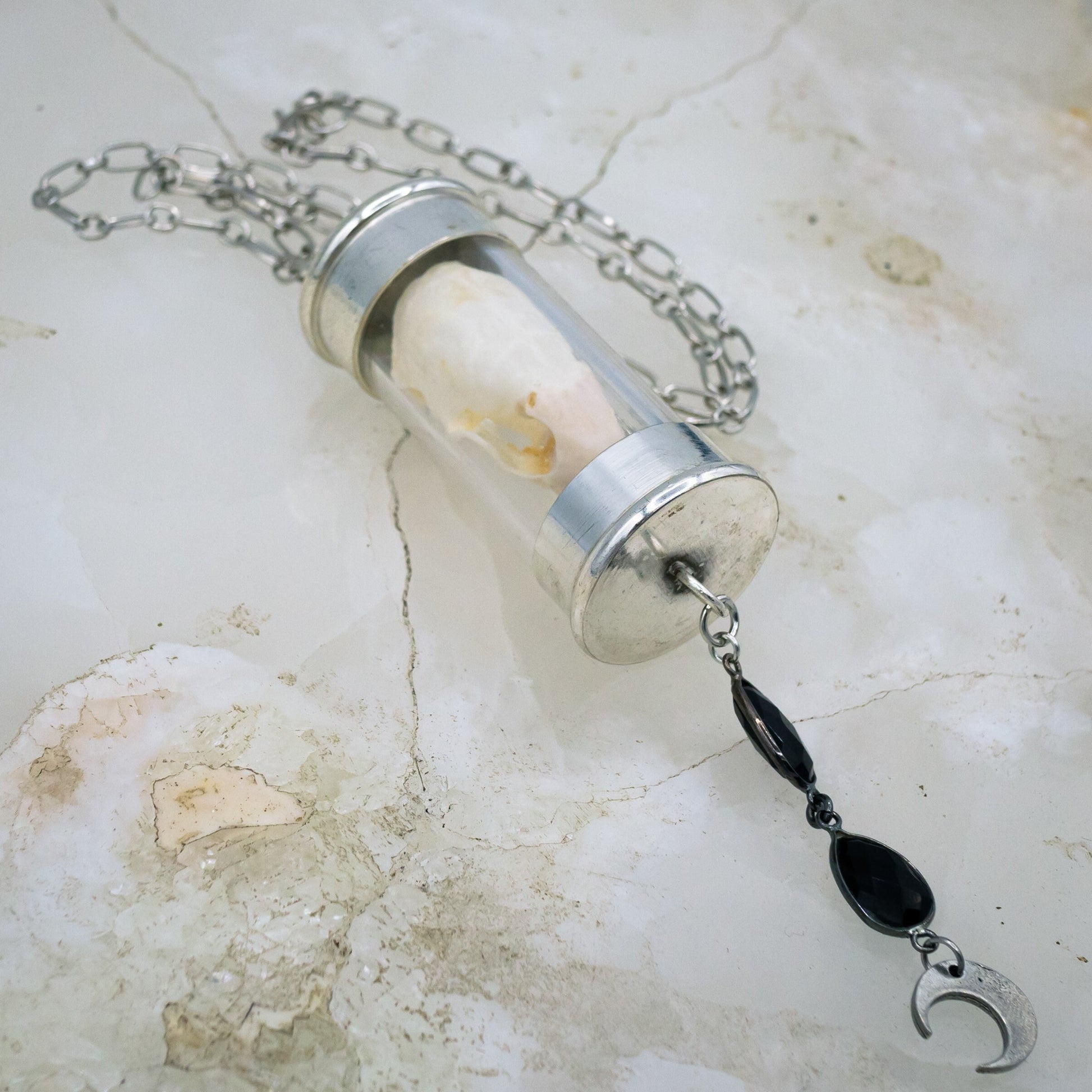 This large vial hangs from a silver chain and holds a genuine weasel skull with dangling black stone teardrops with a silver crescent moon